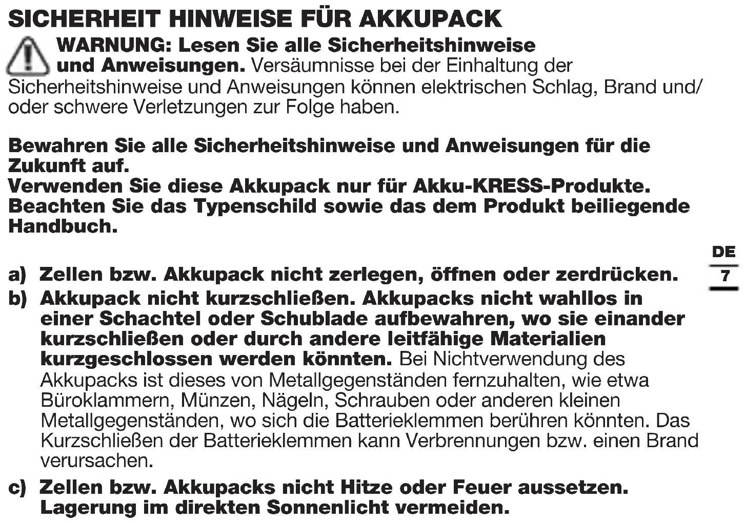 WARNUNG: Lesen Sie alle Sicherheitshinweise und Anweisungen. Versäumnisse bei der Einhaltung der Sicherheitshinweise und Anweisungen können elektrischen Schlag, Brand und/ oder schwere Verletzungen zur Folge haben. Bewahren Sie alle Sicherheitshinweise und Anweisungen für die Zukunft auf. Verwenden Sie diese Akkupack nur für Akku-KRESS-Produkte. Beachten Sie das Typenschild sowie das dem Produkt beiliegende Handbuch. a) Zellen bzw. Akkupack nicht zerlegen, öffnen oder zerdrücken. b) Akkupack nicht kurzschließen. Akkupacks nicht wahllos in einer Schachtel oder Schublade aufbewahren, wo sie einander kurzschließen oder durch andere leitfähige Materialien kurzgeschlossen werden könnten. Bei Nichtverwendung des Akkupacks ist dieses von Metallgegenständen fernzuhalten, wie etwa Büroklammern, Münzen, Nägeln, Schrauben oder anderen kleinen Metallgegenständen, wo sich die Batterieklemmen berühren könnten. Das Kurzschließen der Batterieklemmen kann Verbrennungen bzw. einen Brand verursachen. c) Zellen bzw. Akkupacks nicht Hitze oder Feuer aussetzen. Lagerung im direkten Sonnenlicht vermeiden.8