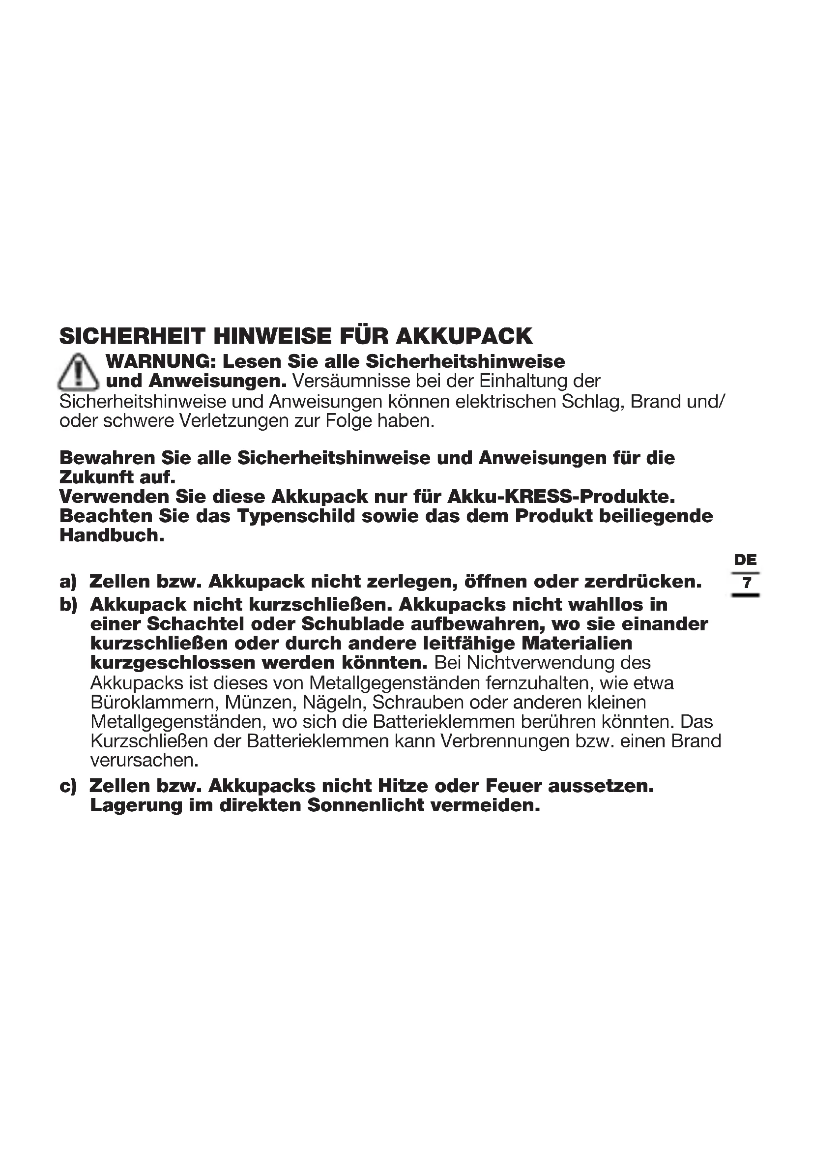 WARNUNG: Lesen Sie alle Sicherheitshinweise und Anweisungen. Versäumnisse bei der Einhaltung der Sicherheitshinweise und Anweisungen können elektrischen Schlag, Brand und/ oder schwere Verletzungen zur Folge haben. Bewahren Sie alle Sicherheitshinweise und Anweisungen für die Zukunft auf. Verwenden Sie diese Akkupack nur für Akku-KRESS-Produkte. Beachten Sie das Typenschild sowie das dem Produkt beiliegende Handbuch. a) Zellen bzw. Akkupack nicht zerlegen, öffnen oder zerdrücken. b) Akkupack nicht kurzschließen. Akkupacks nicht wahllos in einer Schachtel oder Schublade aufbewahren, wo sie einander kurzschließen oder durch andere leitfähige Materialien kurzgeschlossen werden könnten. Bei Nichtverwendung des Akkupacks ist dieses von Metallgegenständen fernzuhalten, wie etwa Büroklammern, Münzen, Nägeln, Schrauben oder anderen kleinen Metallgegenständen, wo sich die Batterieklemmen berühren könnten. Das Kurzschließen der Batterieklemmen kann Verbrennungen bzw. einen Brand verursachen. c) Zellen bzw. Akkupacks nicht Hitze oder Feuer aussetzen. Lagerung im direkten Sonnenlicht vermeiden.8