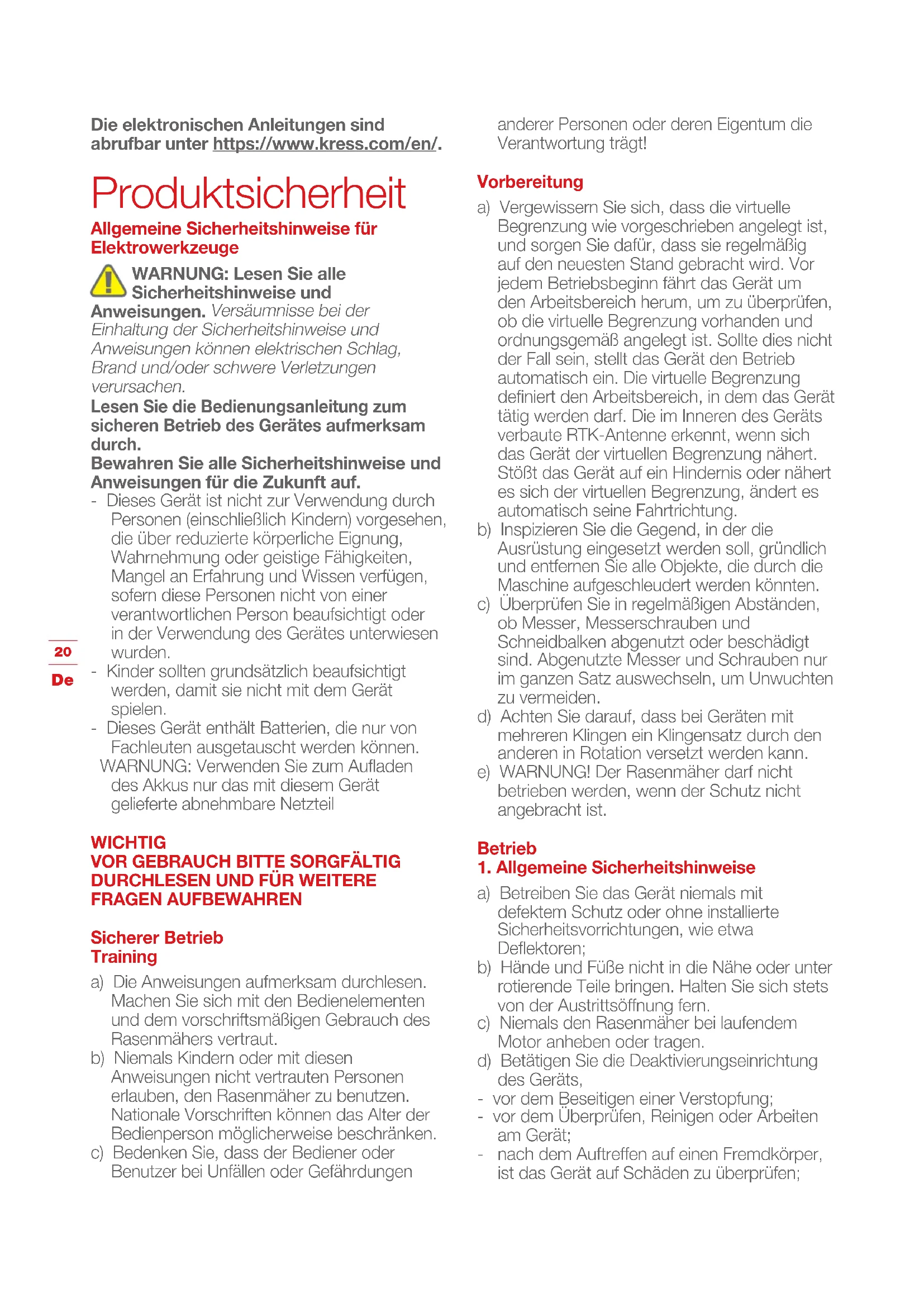 einmal pro Woche kontrollieren und eventuell beschädigte oder verschlissene Teile austauschen. c) Messer und Messerteller besonders sorgfältig auf Schäden untersuchen. Bei Bedarf alle Messer und Schrauben gleichzeitig austauschen, um eine Unwucht der rotierenden Teile zu vermeiden. d) Verwenden Sie beim Austausch nur Original Kress Messer. e) Verwenden Sie zum Laden des Akkus nur das vom Hersteller empfohlene Ladegerät. Eine nicht den Hinweisen entsprechende Verwendung kann zu einem Stromschlag, zur Überhitzung oder zum Auslaufen der Batterieflüssigkeit führen. f) Tritt Batterieflüssigkeit aus, beseitigen Sie sie mit Wasser und einem neutralen Reinigungsmittel. Kommt sie mit Augen etc. in Kontakt, suchen Sie sofort einen Arzt auf. g) Warten Sie den Roboter nach den Anweisungen des Herstellers. Empfehlung Schließen Sie die Maschine und/oder deren Peripheriegeräte nur an einen Speisestromkreis an, der über einen Fehlerstromschutzschalter (RCD) mit einem Auslösestrom von nicht mehr als 30 mA verfügt.22