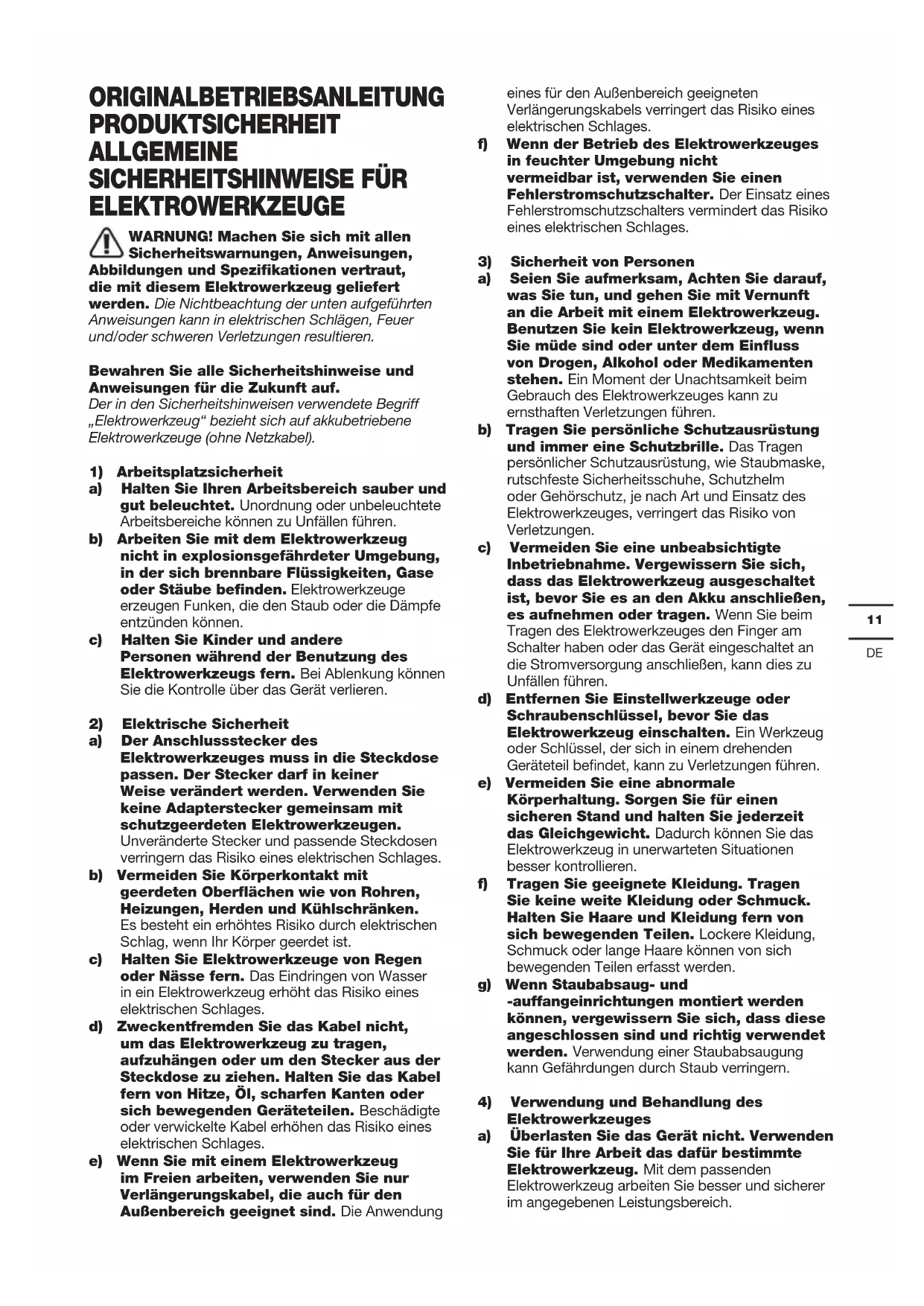 ELEKTROWERKZEUGE WARNUNG! Machen Sie sich mit allen Sicherheitswarnungen, Anweisungen, Abbildungen und Spezifikationen vertraut, die mit diesem Elektrowerkzeug geliefert werden. Die Nichtbeachtung der unten aufgeführten Anweisungen kann in elektrischen Schlägen, Feuer und/oder schweren Verletzungen resultieren. Bewahren Sie alle Sicherheitshinweise und Anweisungen für die Zukunft auf. Der in den Sicherheitshinweisen verwendete Begriff „Elektrowerkzeug“ bezieht sich auf akkubetriebene Elektrowerkzeuge (ohne Netzkabel).