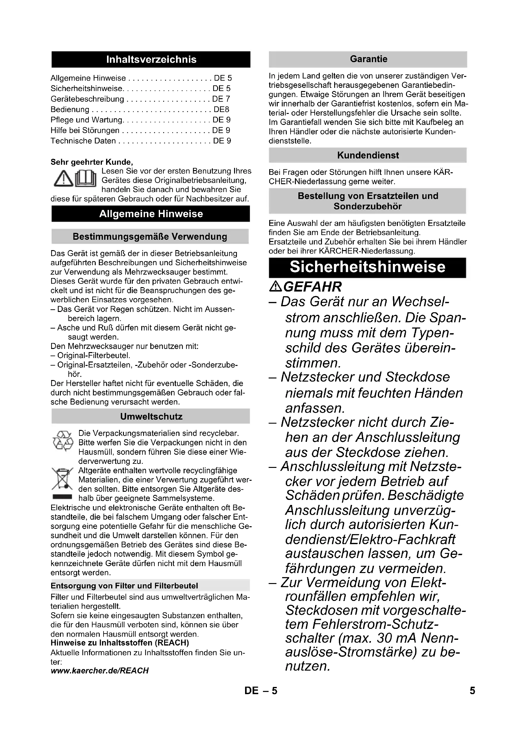 234– 5 Sehr geehrter Kunde, Lesen Sie vor der ersten Benutzung Ihres Gerätes diese Originalbetriebsanleitung, handeln Sie danach und bewahren Sie diese für späteren Gebrauch oder für Nachbesitzer auf. Das Gerät ist gemäß der in dieser Betriebsanleitung aufgeführten Beschreibungen und Sicherheitshinweise zur Verwendung als Mehrzwecksauger bestimmt. Dieses Gerät wurde für den privaten Gebrauch entwi- ckelt und ist nicht für die Beanspruchungen des ge- werblichen Einsatzes vorgesehen. – Das Gerät vor Regen schützen. Nicht im Aussen- bereich lagern. – Asche und Ruß dürfen mit diesem Gerät nicht ge- saugt werden. Den Mehrzwecksauger nur benutzen mit: – Original-Filterbeutel. – Original-Ersatzteilen, -Zubehör oder -Sonderzube- hör. Der Hersteller haftet nicht für eventuelle Schäden, die durch nicht bestimmungsgemäßen Gebrauch oder fal- sche Bedienung verursacht werden. Die Verpackungsmaterialien sind recyclebar. Bitte werfen Sie die Verpackungen nicht in den Hausmüll, sondern führen Sie diese einer Wie- derverwertung zu. Altgeräte enthalten wertvolle recyclingfähige Materialien, die einer Verwertung zugeführt wer- den sollten. Bitte entsorgen Sie Altgeräte des- halb über geeignete Sammelsysteme. Elektrische und elektronische Geräte enthalten oft Be- standteile, die bei falschem Umgang oder falscher Ent- sorgung eine potentielle Gefahr für die menschliche Ge- sundheit und die Umwelt darstellen können. Für den ordnungsgemäßen Betrieb des Gerätes sind diese Be- standteile jedoch notwendig. Mit diesem Symbol ge- kennzeichnete Geräte dürfen nicht mit dem Hausmüll entsorgt werden. Filter und Filterbeutel sind aus umweltverträglichen Ma- terialien hergestellt. Sofern sie keine eingesaugten Substanzen enthalten, die für den Hausmüll verboten sind, können sie über den normalen Hausmüll entsorgt werden. Hinweise zu Inhaltsstoffen (REACH) Aktuelle Informationen zu Inhaltsstoffen finden Sie un- ter: www.kaercher.de/REACH In jedem Land gelten die von unserer zuständigen Ver- triebsgesellschaft herausgegebenen Garantiebedin- gungen. Etwaige Störungen an Ihrem Gerät beseitigen wir innerhalb der Garantiefrist kostenlos, sofern ein Ma- terial- oder Herstellungsfehler die Ursache sein sollte. Im Garantiefall wenden Sie sich bitte mit Kaufbeleg an Ihren Händler oder die nächste autorisierte Kunden- dienststelle. Bei Fragen oder Störungen hilft Ihnen unsere KÄR- CHER-Niederlassung gerne weiter. Eine Auswahl der am häufigsten benötigten Ersatzteile finden Sie am Ende der Betriebsanleitung. Ersatzteile und Zubehör erhalten Sie bei ihrem Händler oder bei ihrer KÄRCHER-Niederlassung. GEFAHR – Das Gerät nur an Wechsel- strom anschließen. Die Span- nung muss mit dem Typen- schild des Gerätes überein- stimmen. – Netzstecker und Steckdose niemals mit feuchten Händen anfassen. – Netzstecker nicht durch Zie- hen an der Anschlussleitung aus der Steckdose ziehen. – Anschlussleitung mit Netzste- cker vor jedem Betrieb auf Schäden prüfen. Beschädigte Anschlussleitung unverzüg- lich durch autorisierten Kun- dendienst/Elektro-Fachkraft austauschen lassen, um Ge- fährdungen zu vermeiden. – Zur Vermeidung von Elekt- rounfällen empfehlen wir, Steckdosen mit vorgeschalte- tem Fehlerstrom-Schutz- schalter (max. 30 mA Nenn- auslöse-Stromstärke) zu be- nutzen. Inhaltsverzeichnis Allgemeine Hinweise ... DE 5 Sicherheitshinweise... DE 5 Gerätebeschreibung ... DE 7 Bedienung ... DE8 Pflege und Wartung... DE 9 Hilfe bei Störungen ... DE 9 Technische Daten ... DE 9 Allgemeine Hinweise Bestimmungsgemäße Verwendung Umweltschutz Entsorgung von Filter und Filterbeutel Garantie Kundendienst Bestellung von Ersatzteilen und Sonderzubehör Sicherheitshinweise 5DE– 6 – Vor allen Pflege– und War- tungsarbeiten das Gerät aus- schalten und den Netzstecker ziehen. – Reparaturarbeiten und Arbei- ten an elektrischen Bauteilen dürfen nur vom autorisierten Kundendienst durchgeführt werden. WARNUNG – Dieses Gerät ist nicht dafür bestimmt, durch Personen mit eingeschränkten physi- schen, sensorischen oder geistigen Fähigkeiten oder mangels Erfahrungen und/ oder mangels Wissen benutzt zu werden, es sei denn, sie werden durch eine für ihre Si- cherheit zuständige Person beaufsichtigt oder erhielten von ihr Anweisungen, wie das Gerät zu benutzen ist und ha- ben die daraus resultieren- den Gefahren verstanden. – Kinder dürfen das Gerät nur dann verwenden, wenn sie über 8 Jahre alt sind und wenn sie durch eine für ihre Sicherheit zuständige Person beaufsichtigt werden oder von ihr Anweisungen erhiel- ten, wie das Gerät zu benut- zen ist und die daraus resul- tierenden Gefahren verstan- den haben. – Kinder dürfen mit dem Gerät nicht spielen. – Kinder beaufsichtigen, um si- cherzustellen, dass sie nicht mit dem Gerät spielen. – Die Reinigung und Anwen- derwartung dürfen von Kin- dern nicht ohne Aufsicht durchgeführt werden. – Verpackungsfolien von Kin- dern fernhalten, es besteht Erstickungsgefahr! – Gerät nach jedem Gebrauch und vor jeder Reinigung/War- tung ausschalten. – Brandgefahr. Keine brennen- den oder glimmenden Ge- genstände aufsaugen. – Der Betrieb in explosionsge- fährdeten Bereichen ist unter- sagt. – Bei Schaumbildung oder Flüssigkeitsaustritt das Gerät sofort ausschalten oder den Netzstecker ziehen! – Keine Scheuermittel, Glas- oder Allzweckreiniger ver- wenden! Gerät niemals in Wasser tauchen. Bestimmte Stoffe können durch die Verwirbelung mit der Saug- luft explosive Dämpfe oder Ge- mische bilden! Nachfolgende Stoffe niemals aufsaugen: – Explosive oder brennbare Gase, Flüssigkeiten und Stäube (reaktive Stäube) – Reaktive Metall-Stäube (z.B. Aluminium, Magnesium, Zink) in Verbindung mit stark alkalischen und sauren Reini- gungsmitteln – Unverdünnte starke Säuren und Laugen 6 DE– 7 – Organische Lösungsmittel (z.B. Benzin, Farbverdünner, Aceton, Heizöl). Zusätzlich können diese Sto