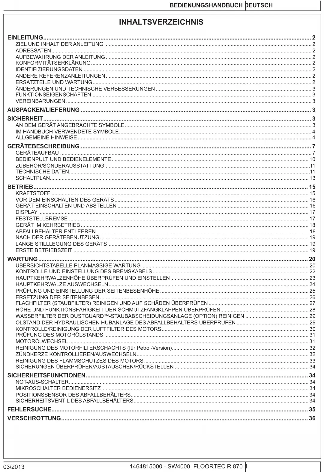 ACHTUNG! Das Gerät nicht auf Oberächen mit einem stärkeren als dem auf dem Gerät angegebenen Gefälle einsetzen. ACHTUNG! Heiße Geräteteile, Verbrennungsgefahr. ACHTUNG! Bewegliche Teile. ACHTUNG! Bewegliche Teile. Quetschgefahr. ACHTUNG! Spannungsführende Teile. Verwendung von ätzenden Flüssigkeiten.DEUTSCH BEDIENUNGSHANDBUCH
