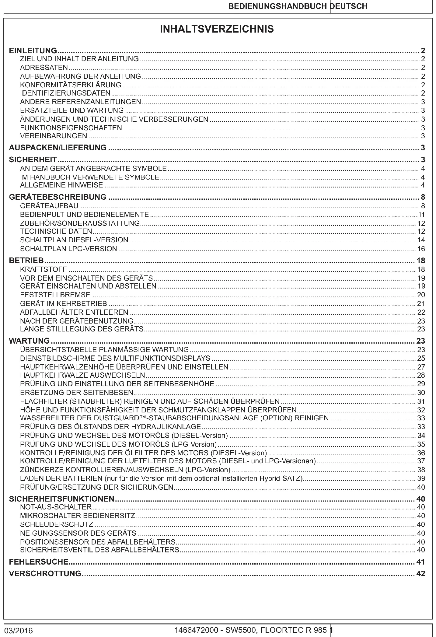 03/2016 ACHTUNG! – Es handelt sich um ein Gerät der Klasse A: es kann im Wohnbereich Funk-Störungen verursachen, für das Treen angemessener Maßnahmen erforderlich sein könnte. – Vor der Verwendung des Geräts sämtliche Klappen und/oder Deckel wie im Bedienungshandbuch angegeben schließen. – Das Gerät nicht mit direktem oder unter Druck stehendem Wasserstrahl oder mit ätzenden Reinigungsmitteln reinigen. – Gerät nur in ausreichend beleuchteten Bereichen einsetzen. – Die Arbeitsleuchten (Option) dienen ausschließlich für eine bessere Sichtbarkeit der zu reinigenden Flächen, aber das Gerät ist nicht für die Arbeit in dunklen Räumen bestimmt. – Bei Verwendung dieses Geräts darauf achten, keine Personen- oder Sachschäden zu verursachen. – Nicht gegen Regale oder Baugerüste stoßen, vor allem wenn Gegenstände herunterfallen könnten. – Keine Flüssigkeitsbehälter auf dem Gerät abstellen. Getränkehalter benutzen. – Die Lagertemperatur des Geräts muss zwischen 0 °C und +40 °C liegen. – Das Gerät nur bei Temperaturen zwischen 0 °C und +40 °C verwenden. – Die Luftfeuchtigkeit muss zwischen 30 % und 95 % liegen. – Das Gerät sowohl während des Betriebs als auch bei Stillstand stets vor Sonne, Regen und anderen Witterungen schützen. Das Gerät in trockenen geschützten Räumen abstellen: (sofern zutreend) Dieses Gerät ist nur für den Trockenbetrieb geeignet und darf nicht unter feuchten Bedingungen in Außenbereichen eingesetzt oder abgestellt werden. – Das Gerät nicht als Transportmittel oder als Schlepp-/Schubfahrzeug verwenden. – Die Zuladefähigkeit des Geräts beträgt zusätzlich zum Gewicht der Bedienperson 240 kg (Gewicht der Abfälle). – Im Brandfall möglichst einen Pulverlöscher und keinen Wasserlöscher verwenden. – Die Fahrgeschwindigkeit an die jeweilige Bodenbeschaenheit anpassen. – Bei Abwärtsfahrten abruptes Bremsen vermeiden. Ruckartige Kurven vermeiden. Abwärts mit verminderter Geschwindigkeit fahren. – Dieses Gerät ist nicht für den Einsatz auf Straßen oder öentlichen Wegen zugelassen. – Die Schutzvorrichtungen des Gerätes keinesfalls beschädigen. – Alle Anweisungen zur ordentlichen Wartung sind gewissenhaft zu befolgen. – Kein Gegenstand durch die Önungen eindringen lassen. Wenn die Önungen verstopft sind, darf das Gerät nicht in Betrieb gesetzt werden. Die Önungen des Geräts frei von Staub, Werg, Haaren und anderen Fremdkörpern halten, die den Luftstrom verringern könnten. – (Nur für Versionen mit installierter Staubabscheidungsanlage DustGuard™). Beim Transport des Geräts bei Bedingungen unter der Gefriertemperatur mit Vorsicht vorgehen. Das Wasser im Sammeltank bzw. in den Rohren kann einfrieren und das Gerät beschädigen. – Die am Gerät angebrachten Hinweisschilder nicht entfernen oder verändern. – Sollte das Gerät aus irgendeinem Grund geschoben werden müssen (Kraftstomangel usw.), die Geschwindigkeit von 4 km/h nicht überschreiten. – Bei Funktionsstörungen sicherstellen, dass diese nicht auf mangelnde Gerätewartung zurückzuführen sind. Andernfalls das Fachpersonal bzw. den autorisierten Kundendienst benachrichtigen. – Müssen Bauteile ausgewechselt werden, stets beim Kundendienst oder einem autorisierten Vertragshändler die ORIGINALERSATZTEILE anfordern. – Zur Gewährleistung von Sicherheit und Leistung die im entsprechenden Kapitel dieses Bedienungshandbuchs vorgesehene planmäßige Wartung von Fachpersonal oder einem autorisierten Kundendienst durchführen lassen. – Das Gerät enthält giftige und schädliche Stoe (Batterien, Öle etc.), für die eine Entsorgung durch entsprechende Stellen (siehe Kapitel „Verschrottung“) gesetzlich vorgeschrieben ist. Fahrzeug am Ende seiner Lebensdauer vorschriftsmäßig entsorgen! – Bei laufendem Motor erwärmt sich der Schalldämpfer. Zur Vermeidung von schweren Verbrennungen und Bränden heißen Schalldämpfer nicht berühren. – Bei Betrieb des Motors mit unzureichendem Öl, kann er schwer beschädigt werden. Ölstand bei ausgeschaltetem Motor und eben abgestelltem Fahrzeug prüfen. – Zur Vermeidung von Schäden Motor nie ohne Luftlter laufen lassen. – Technische Servicearbeiten am Motor müssen von einem autorisierten Vertragshändler durchgeführt werden. Für den Motor nur originale Ersatzteile bzw. gleichwertige Teile verwenden. Nicht gleichwertige Ersatzteile können den Motor schwer beschädigen. – Siehe auch die im Motorhandbuch angeführten SICHERHEITSVORSCHRIFTEN, die als unabdingbarer Bestandteil dieses Bedienungshandbuchs zu betrachten sind.BEDIENUNGSHANDBUCH DEUTSCH