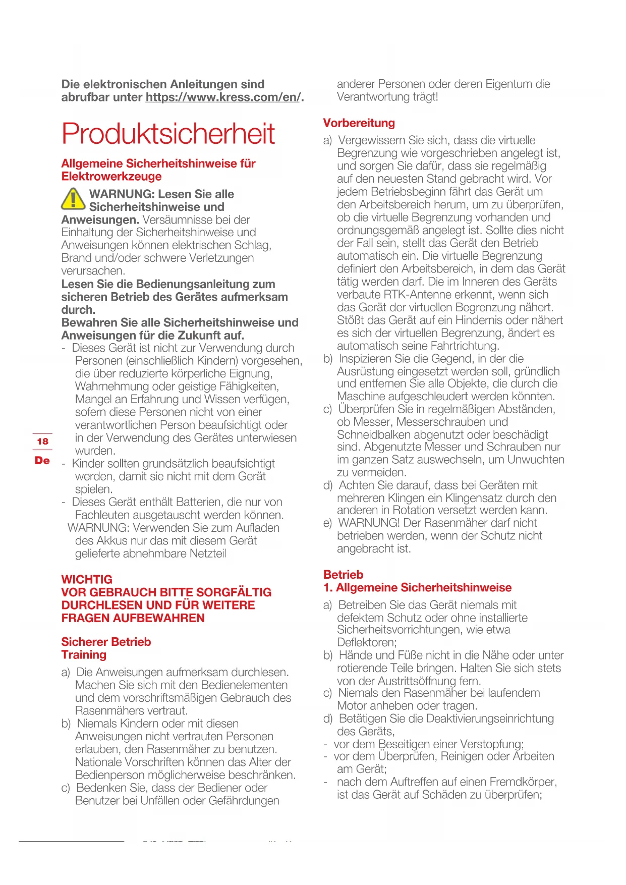 Die elektronischen Anleitungen sind abrufbar unter https://www.kress.com/en/. Produktsicherheit Allgemeine Sicherheitshinweise für Elektrowerkzeuge WARNUNG: Lesen Sie alle Sicherheitshinweise und Anweisungen. Versäumnisse bei der Einhaltung der Sicherheitshinweise und Anweisungen können elektrischen Schlag, Brand und/oder schwere Verletzungen verursachen. Lesen Sie die Bedienungsanleitung zum sicheren Betrieb des Gerätes aufmerksam durch. Bewahren Sie alle Sicherheitshinweise und Anweisungen für die Zukunft auf. - Dieses Gerät ist nicht zur Verwendung durch Personen (einschließlich Kindern) vorgesehen, die über reduzierte körperliche Eignung, Wahrnehmung oder geistige Fähigkeiten, Mangel an Erfahrung und Wissen verfügen, sofern diese Personen nicht von einer verantwortlichen Person beaufsichtigt oder in der Verwendung des Gerätes unterwiesen wurden. - Kinder sollten grundsätzlich beaufsichtigt werden, damit sie nicht mit dem Gerät spielen. - Dieses Gerät enthält Batterien, die nur von Fachleuten ausgetauscht werden können. WARNUNG: Verwenden Sie zum Aufladen des Akkus nur das mit diesem Gerät gelieferte abnehmbare Netzteil WICHTIG