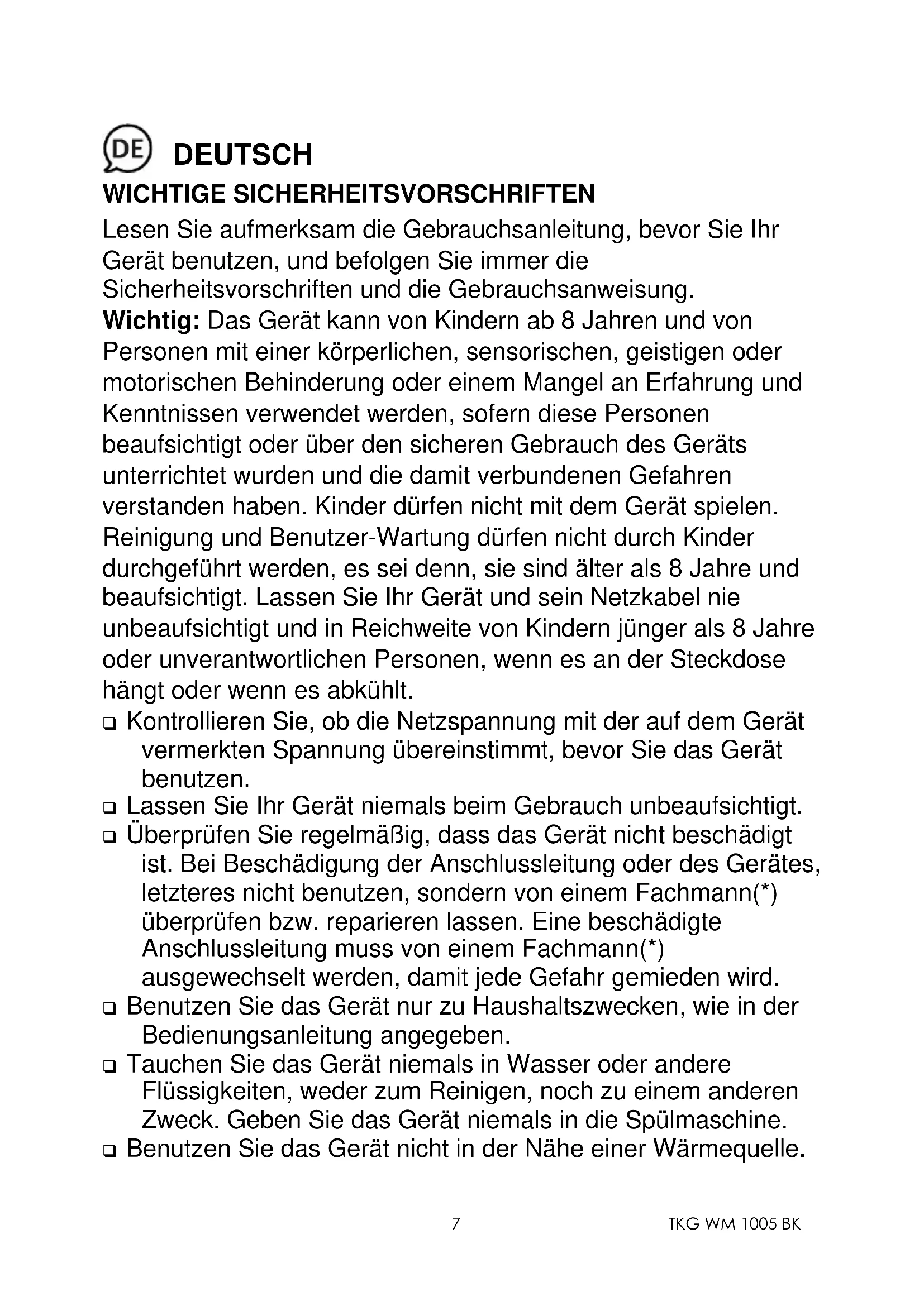 DEUTSCH WICHTIGE SICHERHEITSVORSCHRIFTEN Lesen Sie aufmerksam die Gebrauchsanleitung, bevor Sie Ihr Gerät benutzen, und befolgen Sie immer die Sicherheitsvorschriften und die Gebrauchsanweisung. Wichtig: Das Gerät kann von Kindern ab 8 Jahren und von Personen mit einer körperlichen, sensorischen, geistigen oder motorischen Behinderung oder einem Mangel an Erfahrung und Kenntnissen verwendet werden, sofern diese Personen beaufsichtigt oder über den sicheren Gebrauch des Geräts unterrichtet wurden und die damit verbundenen Gefahren verstanden haben. Kinder dürfen nicht mit dem Gerät spielen. Reinigung und Benutzer-Wartung dürfen nicht durch Kinder durchgeführt werden, es sei denn, sie sind älter als 8 Jahre und beaufsichtigt. Lassen Sie Ihr Gerät und sein Netzkabel nie unbeaufsichtigt und in Reichweite von Kindern jünger als 8 Jahre oder unverantwortlichen Personen, wenn es an der Steckdose hängt oder wenn es abkühlt. ❑ Kontrollieren Sie, ob die Netzspannung mit der auf dem Gerät vermerkten Spannung übereinstimmt, bevor Sie das Gerät benutzen. ❑ Lassen Sie Ihr Gerät niemals beim Gebrauch unbeaufsichtigt. ❑ Überprüfen Sie regelmäßig, dass das Gerät nicht beschädigt ist. Bei Beschädigung der Anschlussleitung oder des Gerätes, letzteres nicht benutzen, sondern von einem Fachmann(*) überprüfen bzw. reparieren lassen. Eine beschädigte Anschlussleitung muss von einem Fachmann(*) ausgewechselt werden, damit jede Gefahr gemieden wird. ❑ Benutzen Sie das Gerät nur zu Haushaltszwecken, wie in der Bedienungsanleitung angegeben. ❑ Tauchen Sie das Gerät niemals in Wasser oder andere Flüssigkeiten, weder zum Reinigen, noch zu einem anderen Zweck. Geben Sie das Gerät niemals in die Spülmaschine. ❑ Benutzen Sie das Gerät nicht in der Nähe einer Wärmequelle.TKG WM 1005 BK