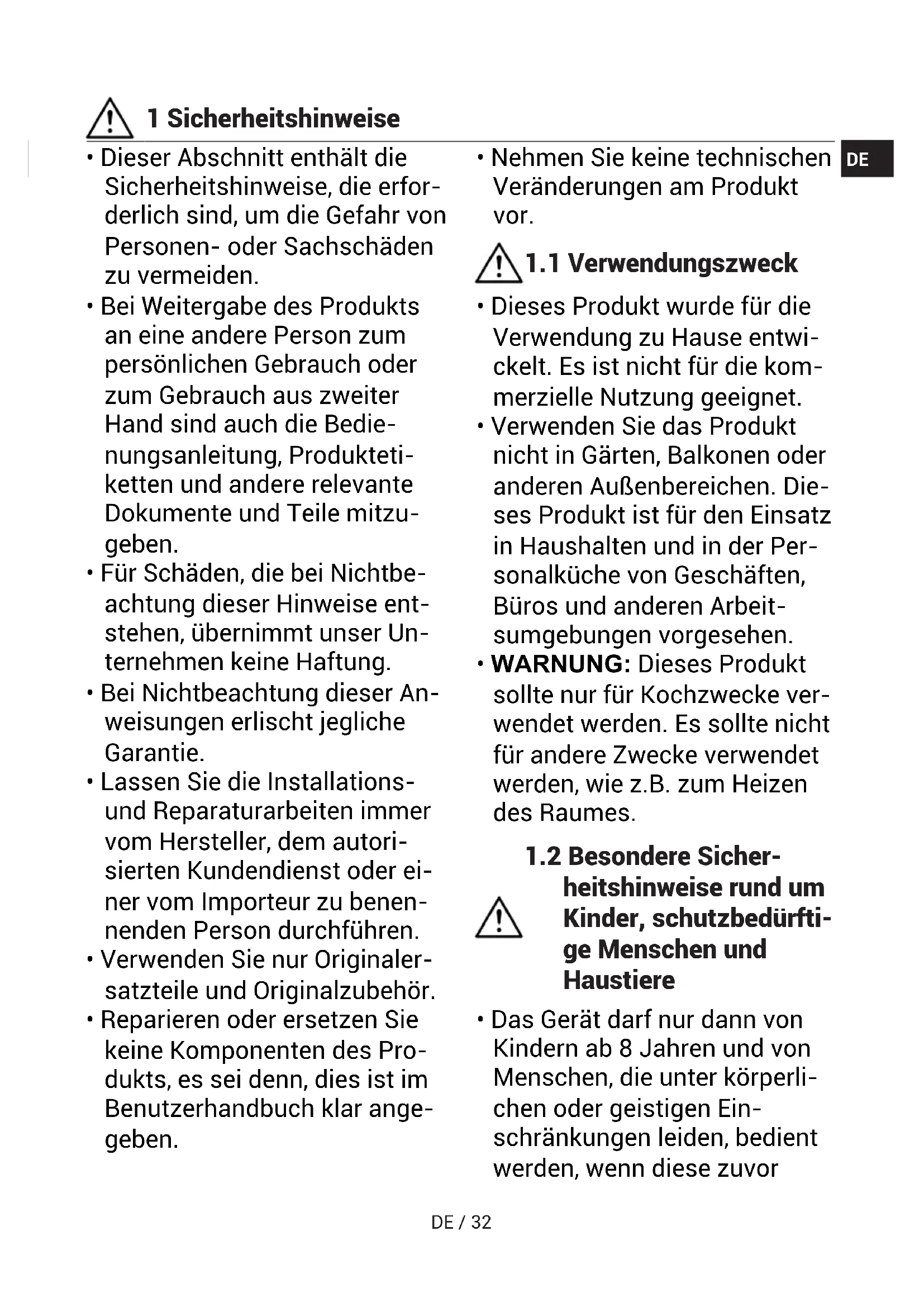 - WARNUNG: Dieses Produkt sollte nur für Kochzwecke ver- wendet werden. Es sollte nicht für andere Zwecke verwendet werden, wie z.B. zum Heizen des Raumes.