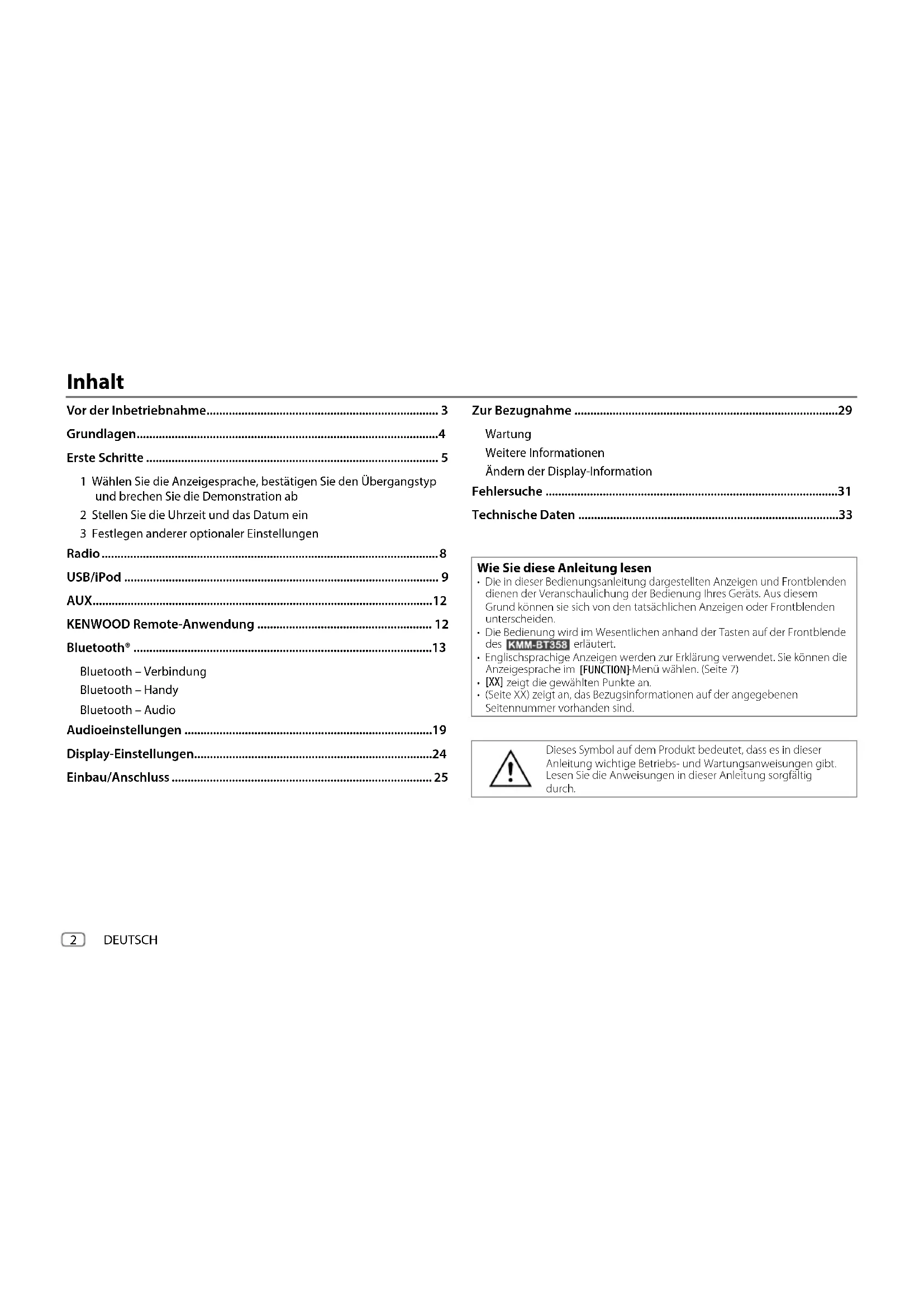 - (Seite XX) zeigt an, das Bezugsinformationen auf der angegebenen Seitennummer vorhanden sind. Dieses Symbol auf dem Produkt bedeutet, dass es in dieser Anleitung wichtige Betriebs- und Wartungsanweisungen gibt. Lesen Sie die Anweisungen in dieser Anleitung sorgfältig durch. KMM-BT358_E_GE.indd 2KMM-BT358_E_GE.indd 2 28/3/2022 11:16:02 AM28/3/2022 11:16:02 AMDEUTSCH