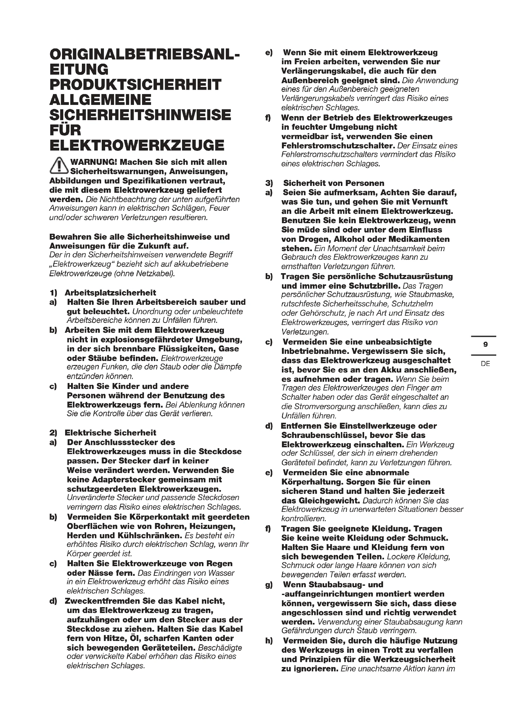 ORIGINALBETRIEBSANL- EITUNG PRODUKTSICHERHEIT ALLGEMEINE SICHERHEITSHINWEISE FÜR ELEKTROWERKZEUGE WARNUNG! Machen Sie sich mit allen Sicherheitswarnungen, Anweisungen, Abbildungen und Spezifikationen vertraut, die mit diesem Elektrowerkzeug geliefert werden. Die Nichtbeachtung der unten aufgeführten Anweisungen kann in elektrischen Schlägen, Feuer und/oder schweren Verletzungen resultieren. Bewahren Sie alle Sicherheitshinweise und Anweisungen für die Zukunft auf. Der in den Sicherheitshinweisen verwendete Begriff „Elektrowerkzeug“ bezieht sich auf akkubetriebene Elektrowerkzeuge (ohne Netzkabel).
