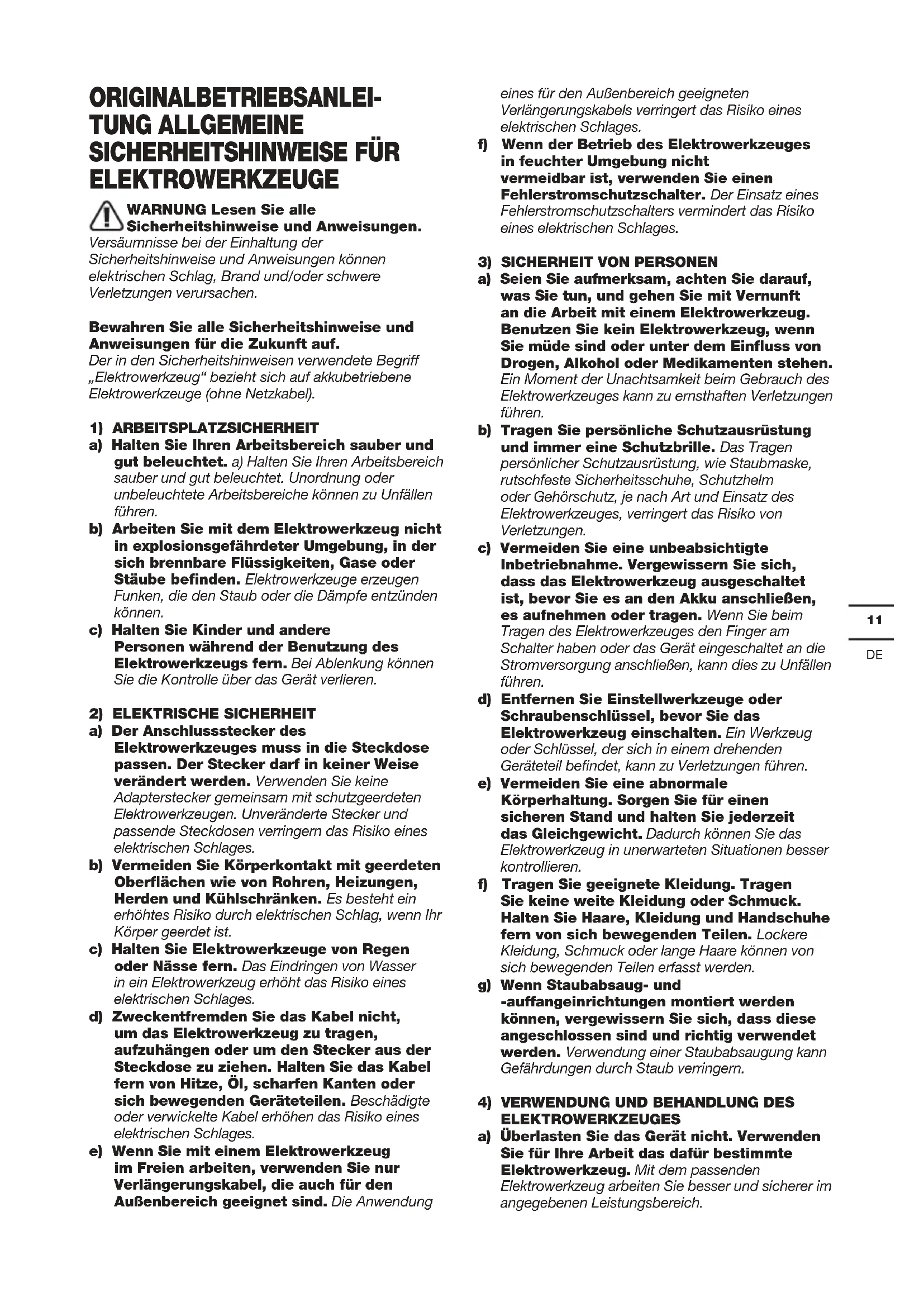 ELEKTROWERKZEUGE WARNUNG Lesen Sie alle Sicherheitshinweise und Anweisungen. Versäumnisse bei der Einhaltung der Sicherheitshinweise und Anweisungen können elektrischen Schlag, Brand und/oder schwere Verletzungen verursachen. Bewahren Sie alle Sicherheitshinweise und Anweisungen für die Zukunft auf. Der in den Sicherheitshinweisen verwendete Begriff „Elektrowerkzeug“ bezieht sich auf akkubetriebene Elektrowerkzeuge (ohne Netzkabel).