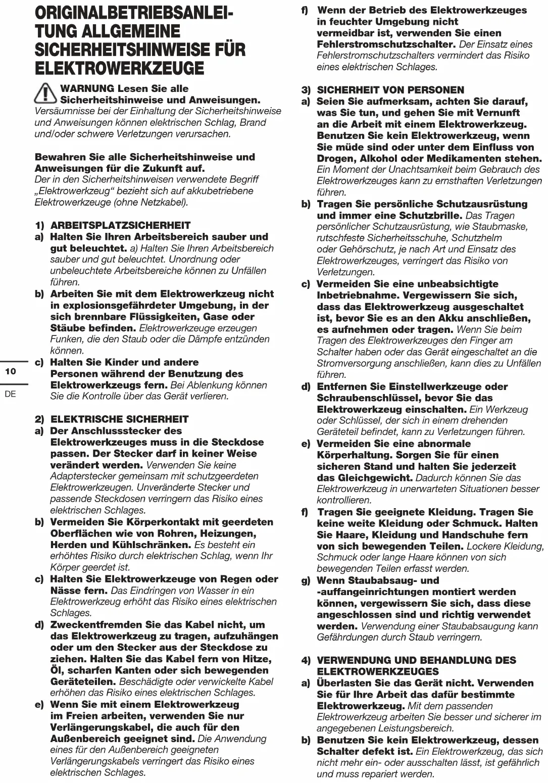 ELEKTROWERKZEUGE WARNUNG Lesen Sie alle Sicherheitshinweise und Anweisungen. Versäumnisse bei der Einhaltung der Sicherheitshinweise und Anweisungen können elektrischen Schlag, Brand und/oder schwere Verletzungen verursachen. Bewahren Sie alle Sicherheitshinweise und Anweisungen für die Zukunft auf. Der in den Sicherheitshinweisen verwendete Begriff „Elektrowerkzeug“ bezieht sich auf akkubetriebene Elektrowerkzeuge (ohne Netzkabel).