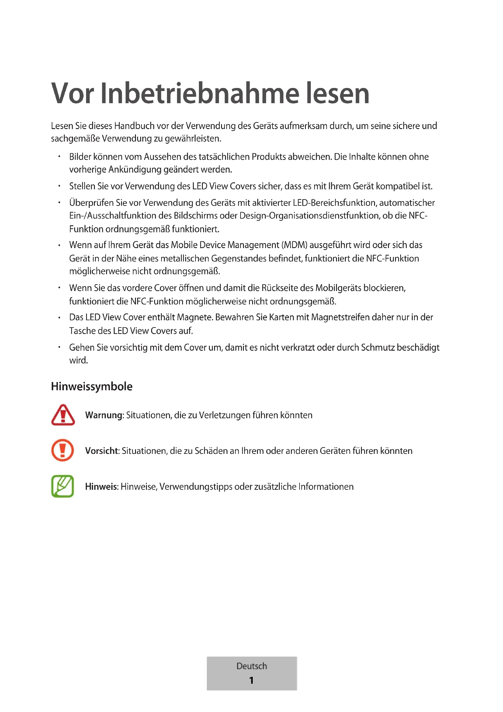 Gehen Sie vorsichtig mit dem Cover um, damit es nicht verkratzt oder durch Schmutz beschädigt wird. Hinweissymbole Warnung: Situationen, die zu Verletzungen führen könnten Vorsicht: Situationen, die zu Schäden an Ihrem oder anderen Geräten führen könnten Hinweis: Hinweise, Verwendungstipps oder zusätzliche Informationen Deutsch