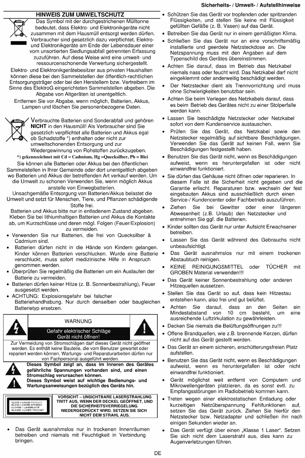 Verbrauchte Batterien sind Sonderabfall und gehören NICHT in den Hausmüll! Als Verbraucher sind Sie gesetzlich verpflichtet alle Batterien und Akkus egal ob Schadstoffe *) enthalten oder nicht zur umweltschonenden Entsorgung und zur Wiedergewinnung von Rohstoffen zurückzugeben. *) gekennzeichnet mit Cd = Cadmium, Hg =Quecksilber, Pb = Blei Sie können alle Batterien oder Akkus bei den öffentlichen Sammelstellen in Ihrer Gemeinde oder dort unentgeltlich abgeben wo Batterien und Akkus der betreffenden Art verkauf werden. Um die Umwelt zu schonen Verwenden Sie, wenn möglich Akkus anstelle von Einwegbatterien. Unsachgemäße Entsorgung von Batterien/Akkus belastet die Umwelt und setzt für Menschen, Tiere, und Pflanzen schädigende Stoffe frei. Batterien und Akkus bitte nur in entladenem Zustand abgeben. Kleben Sie bei lithiumhaltigen Batterien und Akkus die Kontakte ab, um Kurzschlüsse und deren mögl. Folgen (Feuer/Explosion) zu vermeiden.