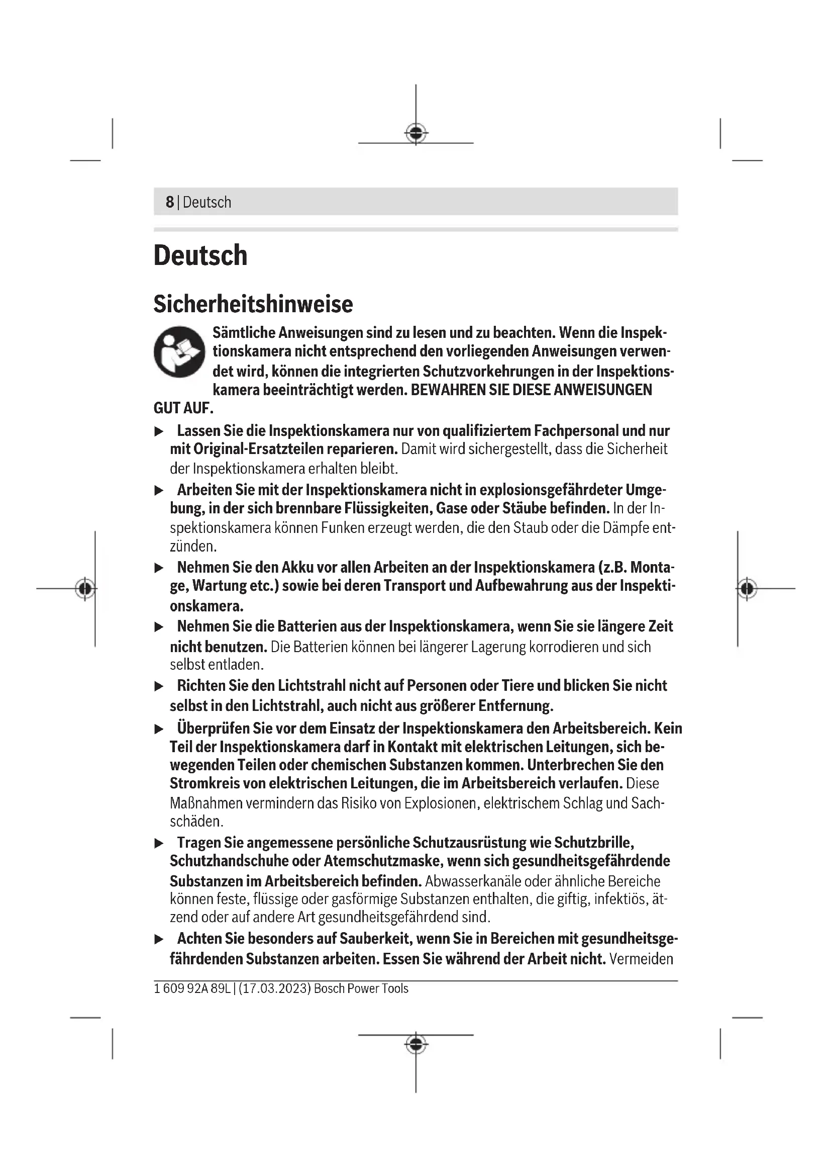 (1) (13) Bosch Power Tools 1 609 92A 89L | (17.03.2023)8 | Deutsch Deutsch Sicherheitshinweise Sämtliche Anweisungen sind zu lesen und zu beachten. Wenn die Inspek- tionskamera nicht entsprechend den vorliegenden Anweisungen verwen- det wird, können die integrierten Schutzvorkehrungen in der Inspektions- kamera beeinträchtigt werden. BEWAHREN SIE DIESE ANWEISUNGEN GUT AUF. u Lassen Sie die Inspektionskamera nur von qualifiziertem Fachpersonal und nur mit Original-Ersatzteilen reparieren. Damit wird sichergestellt, dass die Sicherheit der Inspektionskamera erhalten bleibt. u Arbeiten Sie mit der Inspektionskamera nicht in explosionsgefährdeter Umge- bung, in der sich brennbare Flüssigkeiten, Gase oder Stäube befinden. In der In- spektionskamera können Funken erzeugt werden, die den Staub oder die Dämpfe ent- zünden. u Nehmen Sie den Akku vor allen Arbeiten an der Inspektionskamera (z.B. Monta- ge, Wartung etc.) sowie bei deren Transport und Aufbewahrung aus der Inspekti- onskamera. u Nehmen Sie die Batterien aus der Inspektionskamera, wenn Sie sie längere Zeit nicht benutzen. Die Batterien können bei längerer Lagerung korrodieren und sich selbst entladen. u Richten Sie den Lichtstrahl nicht auf Personen oder Tiere und blicken Sie nicht selbst in den Lichtstrahl, auch nicht aus größerer Entfernung. u Überprüfen Sie vor dem Einsatz der Inspektionskamera den Arbeitsbereich. Kein Teil der Inspektionskamera darf in Kontakt mit elektrischen Leitungen, sich be- wegenden Teilen oder chemischen Substanzen kommen. Unterbrechen Sie den Stromkreis von elektrischen Leitungen, die im Arbeitsbereich verlaufen. Diese Maßnahmen vermindern das Risiko von Explosionen, elektrischem Schlag und Sach- schäden. u Tragen Sie angemessene persönliche Schutzausrüstung wie Schutzbrille, Schutzhandschuhe oder Atemschutzmaske, wenn sich gesundheitsgefährdende Substanzen im Arbeitsbereich befinden. Abwasserkanäle oder ähnliche Bereiche können feste, flüssige oder gasförmige Substanzen enthalten, die giftig, infektiös, ät- zend oder auf andere Art gesundheitsgefährdend sind. u Achten Sie besonders auf Sauberkeit, wenn Sie in Bereichen mit gesundheitsge- fährdenden Substanzen arbeiten. Essen Sie während der Arbeit nicht. Vermeiden 1 609 92A 89L | (17.03.2023) Bosch Power ToolsDeutsch | 9 Sie den Kontakt mit den gesundheitsgefährdenden Substanzen und reinigen Sie nach der Arbeit Hände und andere Körperteile, die in Kontakt gekommen sein könnten, mit heißer Seifenlauge. Dadurch wird die Gesundheitsgefährdung verringert. u Stehen Sie nicht im Wasser, wenn Sie die Inspektionskamera benutzen. Durch Ar- beiten im Wasser besteht das Risiko eines elektrischen Schlages. u Öffnen Sie den Akku nicht. Es besteht die Gefahr eines Kurzschlusses. u Bei Beschädigung und unsachgemäßem Gebrauch des Akkus können Dämpfe austreten. Der Akku kann brennen oder explodieren. Führen Sie Frischluft zu und suchen Sie bei Beschwerden einen Arzt auf. Die Dämpfe können die Atemwege rei- zen. u Bei falscher Anwendung oder beschädigtem Akku kann brennbare Flüssigkeit aus dem Akku austreten. Vermeiden Sie den Kontakt damit. Bei zufälligem Kon- takt mit Wasser abspülen. Wenn die Flüssigkeit in die Augen kommt, nehmen Sie zusätzlich ärztliche Hilfe in Anspruch. Austretende Akkuflüssigkeit kann zu Hautrei- zungen oder Verbrennungen führen. u Durch spitze Gegenstände wie z. B. Nagel oder Schraubenzieher oder durch äu- ßere Krafteinwirkung kann der Akku beschädigt werden. Es kann zu einem inter- nen Kurzschluss kommen und der Akku brennen, rauchen, explodieren oder überhit- zen. u Halten Sie den nicht benutzten Akku fern von Büroklammern, Münzen, Schlüs- seln, Nägeln, Schrauben oder anderen kleinen Metallgegenständen, die eine Überbrückung der Kontakte verursachen könnten. Ein Kurzschluss zwischen den Akkukontakten kann Verbrennungen oder Feuer zur Folge haben. u Verwenden Sie den Akku nur in Produkten des Herstellers. Nur so wird der Akku vor gefährlicher Überlastung geschützt. u Laden Sie die Akkus nur mit Ladegeräten auf, die vom Hersteller empfohlen wer- den. Durch ein Ladegerät, das für eine bestimmte Art von Akkus geeignet ist, besteht Brandgefahr, wenn es mit anderen Akkus verwendet wird. Schützen Sie den Akku vor Hitze, z. B. auch vor dauernder Son- neneinstrahlung, Feuer, Schmutz, Wasser und Feuchtigkeit. Es besteht Explosions- und Kurzschlussgefahr. WARNUNG Bosch Power Tools 1 609 92A 89L | (17.03.2023)10 | Deutsch Stellen Sie sicher, dass die Knopfzelle nicht in die Hände von Kindern gelangt. Knopfzellen sind gefährlich. u Knopfzellen dürfen niemals verschluckt oder in andere Körperöffnungen einge- führt werden. Wenn der Verdacht besteht, dass die Knopfzelle verschluckt oder in eine andere Körperöffnung eingeführt wurde, suchen Sie sofort einen Arzt auf. Ein Verschlucken der Knopfzelle kann innerhalb von 2 Stunden zu ernsthaften in- neren Verätzungen und zum Tod führen. Bringen Sie die magnetischen Zubehöre nicht in die Nähe von Im- plantaten und sonstigen medizinischen Geräten, wie z.B. Herz- schrittmacher oder Insulinpumpe. Durch die Magnete der Zube- höre wird ein Feld erzeugt, das die Funktion von Implantaten oder medizinischen Geräten beeinträchtigen kann. u Halten Sie die magnetischen Zubehöre fern von magnetischen Datenträgern und magnetisch empfindlichen Geräten. Durch die Wirkung der Magnete der Zubehöre kann es zu irreversiblen Datenverlusten kommen. Produkt- und Leistungsbeschreibung Bitte beachten Sie die Abbildungen im vorderen Teil der Betriebsanleitung. Bestimmungsgemäßer Gebrauch Die digitale Inspektionskamera ist geeignet zur Inspektion schwer zugänglicher oder dunkler Bereiche. Sie ist nach Montage der mitgelieferten Hilfsmittel am Kamerakopf auch zum Bewegen und Entfernen kleiner und leichter Gegenstände (z.B. kleiner Schrau- ben) geeignet. Die digitale Inspektionskamera darf nicht für medizinische Zwecke verwendet werden. Sie ist 