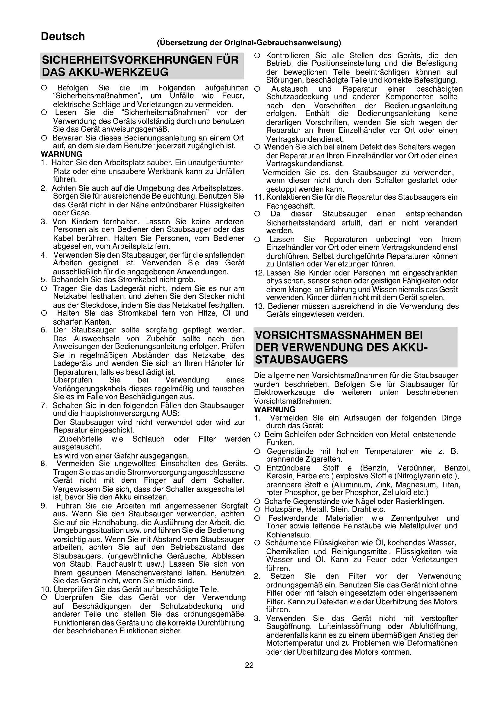 DAS AKKU-WERKZEUG ○ Befolgen Sie die im Folgenden aufgeführten “Sicherheitsmaßnahmen”, um Unfälle wie Feuer, elektrische Schläge und Verletzungen zu vermeiden. ○ Lesen Sie die “Sicherheitsmaßnahmen” vor der Verwendung des Geräts vollständig durch und benutzen Sie das Gerät anweisungsgemäß. ○ Bewaren Sie dieses Bedienungsanleitung an einem Ort auf, an dem sie dem Benutzer jederzeit zugänglich ist. WARNUNG