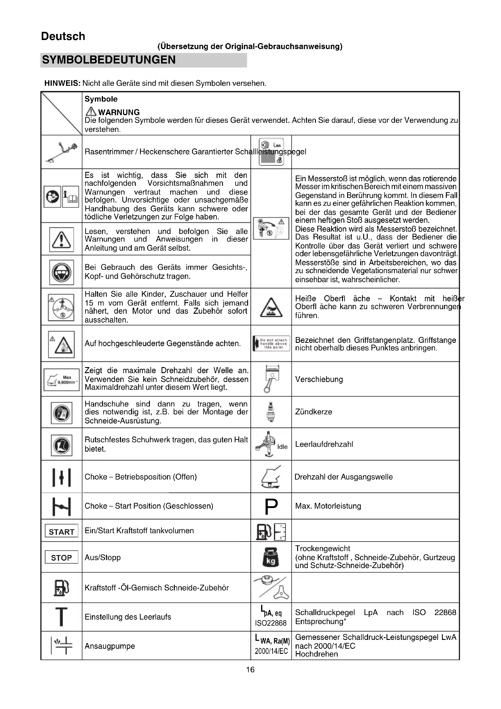 (Übersetzung der Original-Gebrauchsanweisung) SYMBOLBEDEUTUNGEN HINWEIS: Nicht alle Geräte sind mit diesen Symbolen versehen. Symbole WARNUNG Die folgenden Symbole werden für dieses Gerät verwendet. Achten Sie darauf, diese vor der Verwendung zu verstehen. Rasentrimmer / Heckenschere Garantierter Schallleistungspegel Es ist wichtig, dass Sie sich mit den nachfolgenden Vorsichtsmaßnahmen und Warnungen vertraut machen und diese befolgen. Unvorsichtige oder unsachgemäße Handhabung des Geräts kann schwere oder tödliche Verletzungen zur Folge haben. Ein Messerstoß ist möglich, wenn das rotierende Messer im kritischen Bereich mit einem massiven Gegenstand in Berührung kommt. In diesem Fall kann es zu einer gefährlichen Reaktion kommen, bei der das gesamte Gerät und der Bediener einem heftigen Stoß ausgesetzt werden. Diese Reaktion wird als Messerstoß bezeichnet. Das Resultat ist u.U., dass der Bediener die Kontrolle über das Gerät verliert und schwere oder lebensgefährliche Verletzungen davonträgt. Messerstöße sind in Arbeitsbereichen, wo das zu schneidende Vegetationsmaterial nur schwer einsehbar ist, wahrscheinlicher. Lesen, verstehen und befolgen Sie alle Warnungen und Anweisungen in dieser Anleitung und am Gerät selbst. Bei Gebrauch des Geräts immer Gesichts-, Kopf- und Gehörschutz tragen. Halten Sie alle Kinder, Zuschauer und Helfer 15 m vom Gerät entfernt. Falls sich jemand nähert, den Motor und das Zubehör sofort ausschalten. Heiße Oberfl äche – Kontakt mit heißer Oberfl äche kann zu schweren Verbrennungen führen. Auf hochgeschleuderte Gegenstände achten. Bezeichnet den Griff stangenplatz. Griff stange nicht oberhalb dieses Punktes anbringen. min