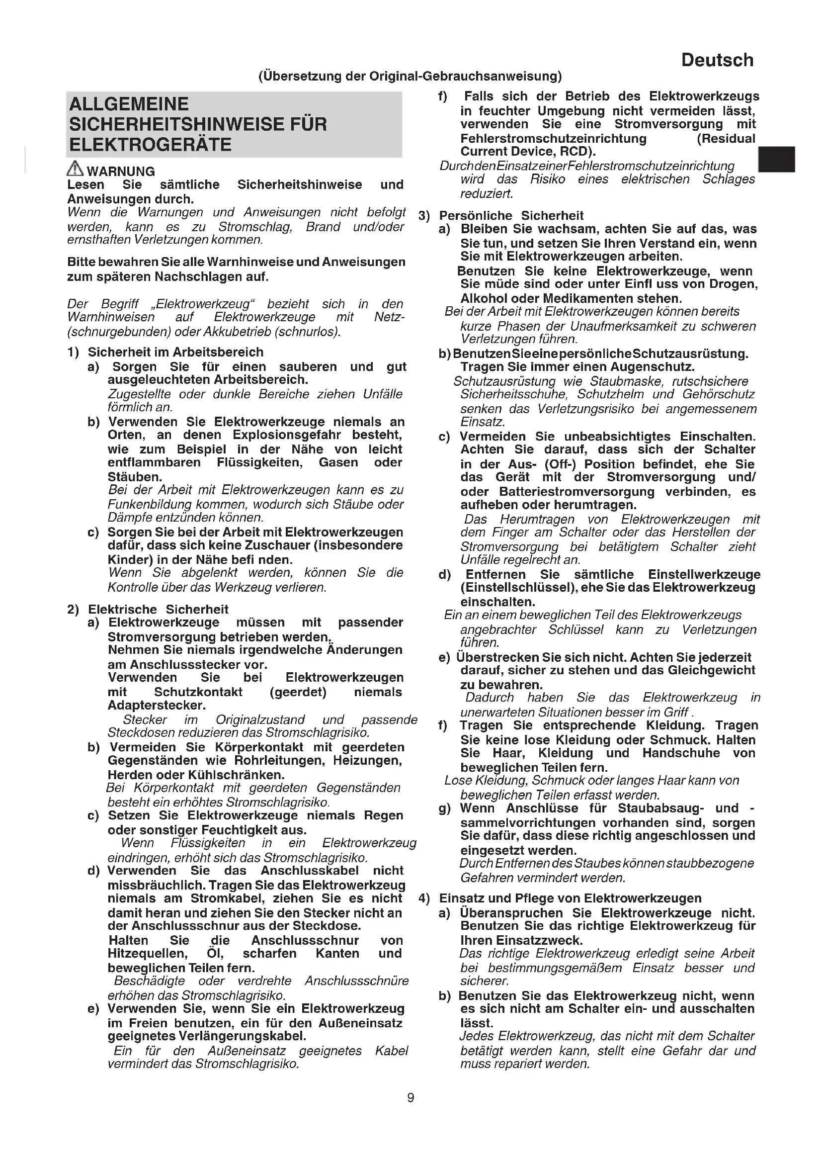 a) Überanspruchen Sie Elektrowerkzeuge nicht. Benutzen Sie das richtige Elektrowerkzeug für Ihren Einsatzzweck. Das richtige Elektrowerkzeug erledigt seine Arbeit bei bestimmungsgemäßem Einsatz besser und sicherer. b) Benutzen Sie das Elektrowerkzeug nicht, wenn es sich nicht am Schalter ein- und ausschalten lässt. Jedes Elektrowerkzeug, das nicht mit dem Schalter betätigt werden kann, stellt eine Gefahr dar und muss repariert werden. ALLGEMEINE