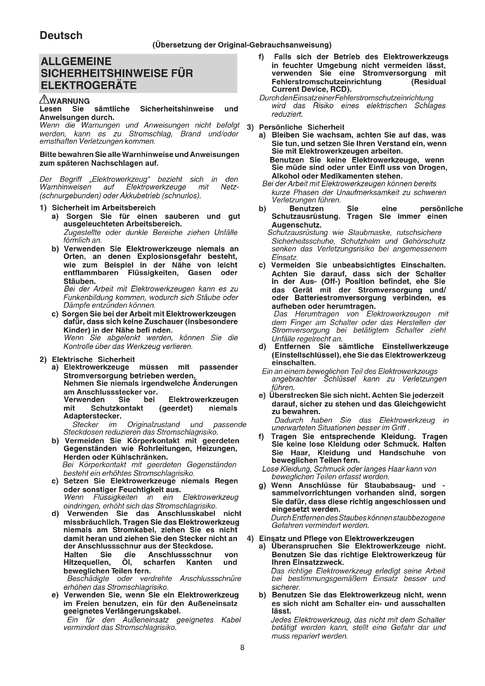 ELEKTROGERÄTE WARNUNG Lesen Sie sämtliche Sicherheitshinweise und Anweisungen durch. Wenn die Warnungen und Anweisungen nicht befolgt werden, kann es zu Stromschlag, Brand und/oder ernsthaften Verletzungen kommen. Bitte bewahren Sie alle Warnhinweise und Anweisungen zum späteren Nachschlagen auf. Der Begriff „Elektrowerkzeug“ bezieht sich in den Warnhinweisen auf Elektrowerkzeuge mit Netz- (schnurgebunden) oder Akkubetrieb (schnurlos).