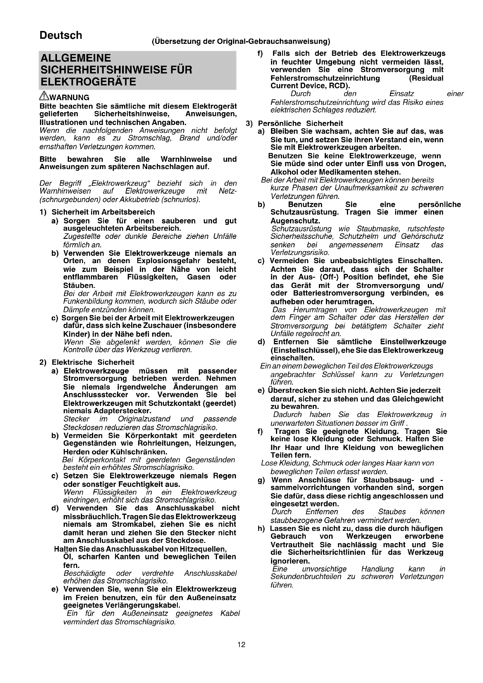 ELEKTROGERÄTE WARNUNG Bitte beachten Sie sämtliche mit diesem Elektrogerät gelieferten Sicherheitshinweise, Anweisungen, Illustrationen und technischen Angaben. Wenn die nachfolgenden Anweisungen nicht befolgt werden, kann es zu Stromschlag, Brand und/oder ernsthaften Verletzungen kommen. Bitte bewahren Sie alle Warnhinweise und Anweisungen zum späteren Nachschlagen auf. Der Begriff „Elektrowerkzeug“ bezieht sich in den Warnhinweisen auf Elektrowerkzeuge mit Netz- (schnurgebunden) oder Akkubetrieb (schnurlos).