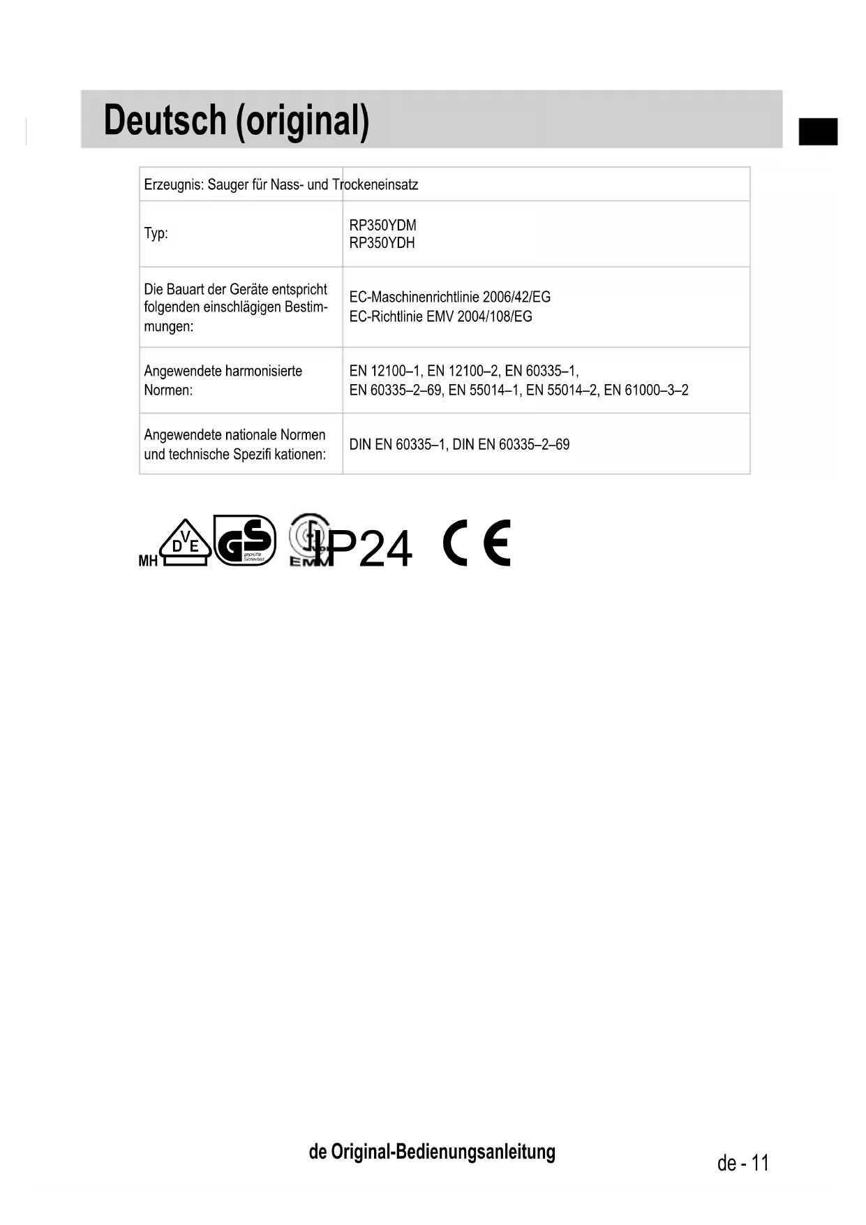 de Original-Bedienungsanleitung Erzeugnis: Sauger für Nass- und Trockeneinsatz Typ: RP350YDMRP350YDHDie Bauart der Geräte entspricht folgenden einschlägigen Bestim-mungen:EC-Maschinenrichtlinie 2006/42/EGEC-Richtlinie EMV 2004/108/EGAngewendete harmonisierte Normen:EN 12100–1, EN 12100–2, EN 60335–1, EN 60335–2–69, EN 55014–1, EN 55014–2, EN 61000–3–2Angewendete nationale Normen und technische Spezifi kationen:DIN EN 60335–1, DIN EN 60335–2–69MHLs IP24 0 Deutsch (original) 000BookRP350YDM.indb11000BookRP350YDM.indb11 2019/10/267:30:332019/10/267:30:3312 - de l GEFAHR! ▶Erstickungsgefahr ● Verpackungsmaterial, wie Folienbeutel, ge hören nicht in die Kinderhände. ▶Nie auf den Sauger steigen oder sitzen. ▶Besondere Sorgfalt ist beim Saugen von Treppen geboten. Achten Sie auf sicheren Stand. ▶Anschlussleitung und Saugschlauch nicht über scharfe Kanten ziehen, knicken oder einklemmen. ▶Anschlussleitung und Saugschlauch immer so verlegen, dass niemand darüber stolpern kann. ▶Bei Austritt von Schaum oder Flüssigkeit den Sauger sofort ausschalten. ▶Das Deckelinnere immer trocken halten. ▶Sauger einschließlich Zubehör nicht in Betrieb nehmen, wenn: ● Sauger erkennbare Schäden (Risse/Brüche) aufweist, ● Netzanschlussleitung defekt ist oder Rissbildung bzw. Alterung aufweisen, ● Verdacht besteht auf einen unsichtbaren Defekt (nach einem Sturz). ▶Rotierende Elektrobürsten nicht mit der Netzanschlussleitung in Berührung kommen lassen. l GEFAHR! ▶Der Sauger darf nicht in explosionsgefährdeten Räumen betrieben werden. ▶Den Sauger von entfl ammbaren Gasen und Substanzen fernhalten. l GEFAHR! ▶Es dürfen keine brennbaren oder ex plosiven Lösungsmittel, mit Lösungsmittel getränktes Gut, explosionsgefährliche Stäube, Flüssigkeiten wie Benzin, Öl, Alkohol, Verdünnung oder Gut, das heißer als 60 °C ist, aufgesaugt werden. ▷Es besteht sonst Explosions- und Brandgefahr! l GEFAHR! ▶Reparaturen nur von Fachkräften, z.B. Kundendienst, ausführen lassen. Nur Original-Ersatzteile verwenden. ▶Nicht fachgerecht reparierte Geräte stellen eine Gefahr für den Benutzer dar. 000BookRP350YDM.indb12000BookRP350YDM.indb12 2019/10/267:30:332019/10/267:30:33de - 13