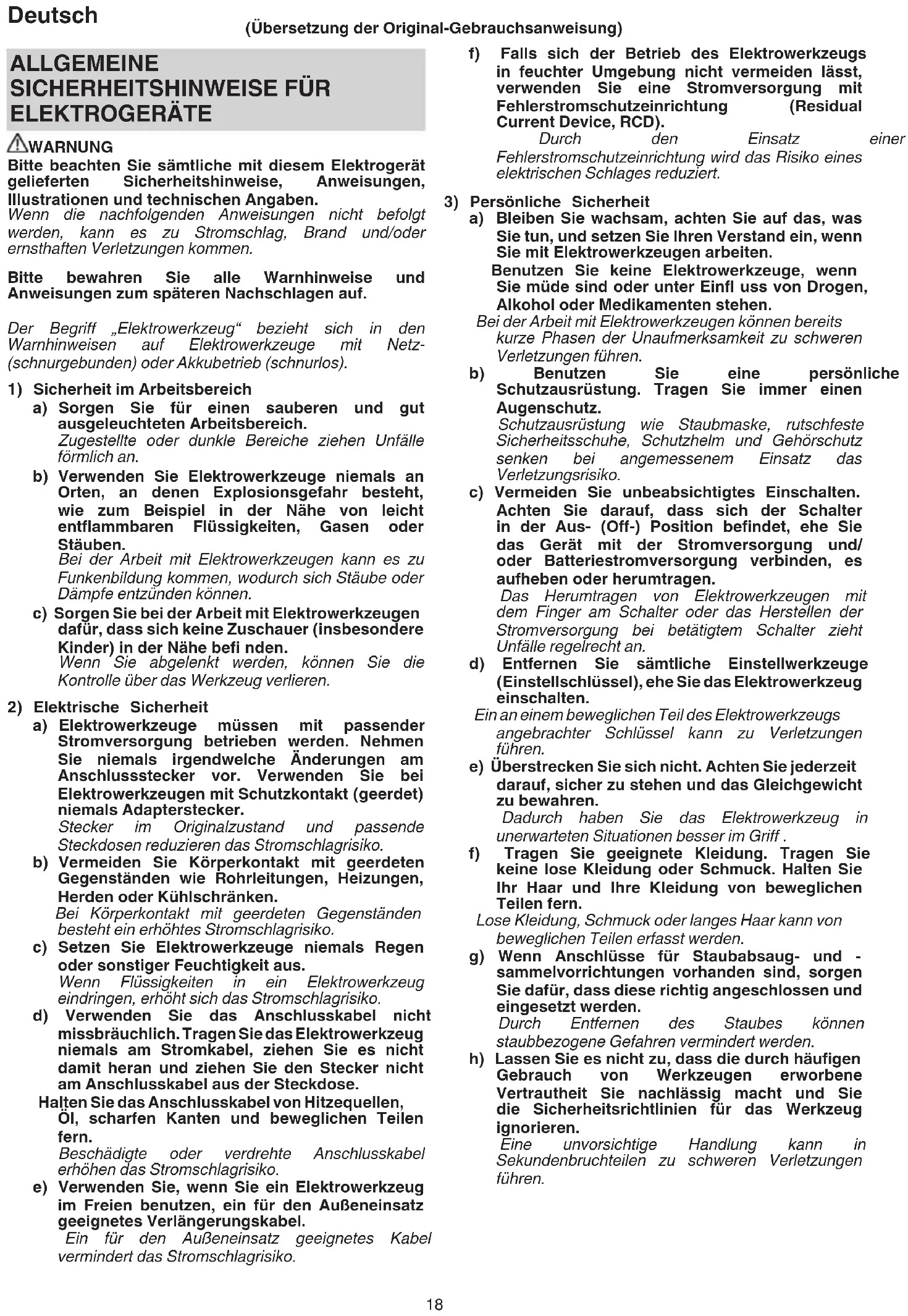 ELEKTROGERÄTE WARNUNG Bitte beachten Sie sämtliche mit diesem Elektrogerät gelieferten Sicherheitshinweise, Anweisungen, Illustrationen und technischen Angaben. Wenn die nachfolgenden Anweisungen nicht befolgt werden, kann es zu Stromschlag, Brand und/oder ernsthaften Verletzungen kommen. Bitte bewahren Sie alle Warnhinweise und Anweisungen zum späteren Nachschlagen auf. Der Begriff „Elektrowerkzeug“ bezieht sich in den Warnhinweisen auf Elektrowerkzeuge mit Netz- (schnurgebunden) oder Akkubetrieb (schnurlos).