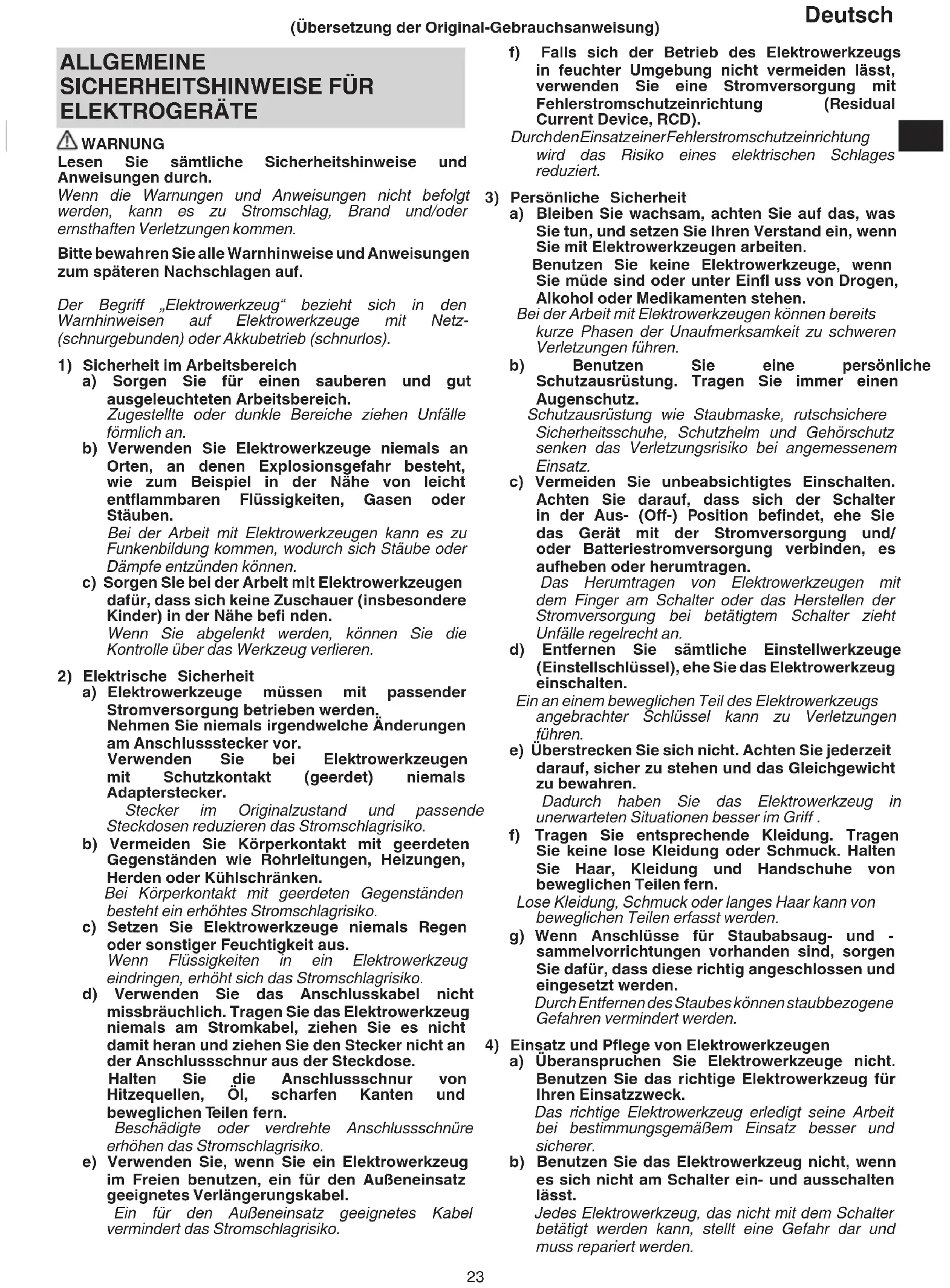 a) Überanspruchen Sie Elektrowerkzeuge nicht. Benutzen Sie das richtige Elektrowerkzeug für Ihren Einsatzzweck. Das richtige Elektrowerkzeug erledigt seine Arbeit bei bestimmungsgemäßem Einsatz besser und sicherer. b) Benutzen Sie das Elektrowerkzeug nicht, wenn es sich nicht am Schalter ein- und ausschalten lässt. Jedes Elektrowerkzeug, das nicht mit dem Schalter betätigt werden kann, stellt eine Gefahr dar und muss repariert werden. ALLGEMEINE