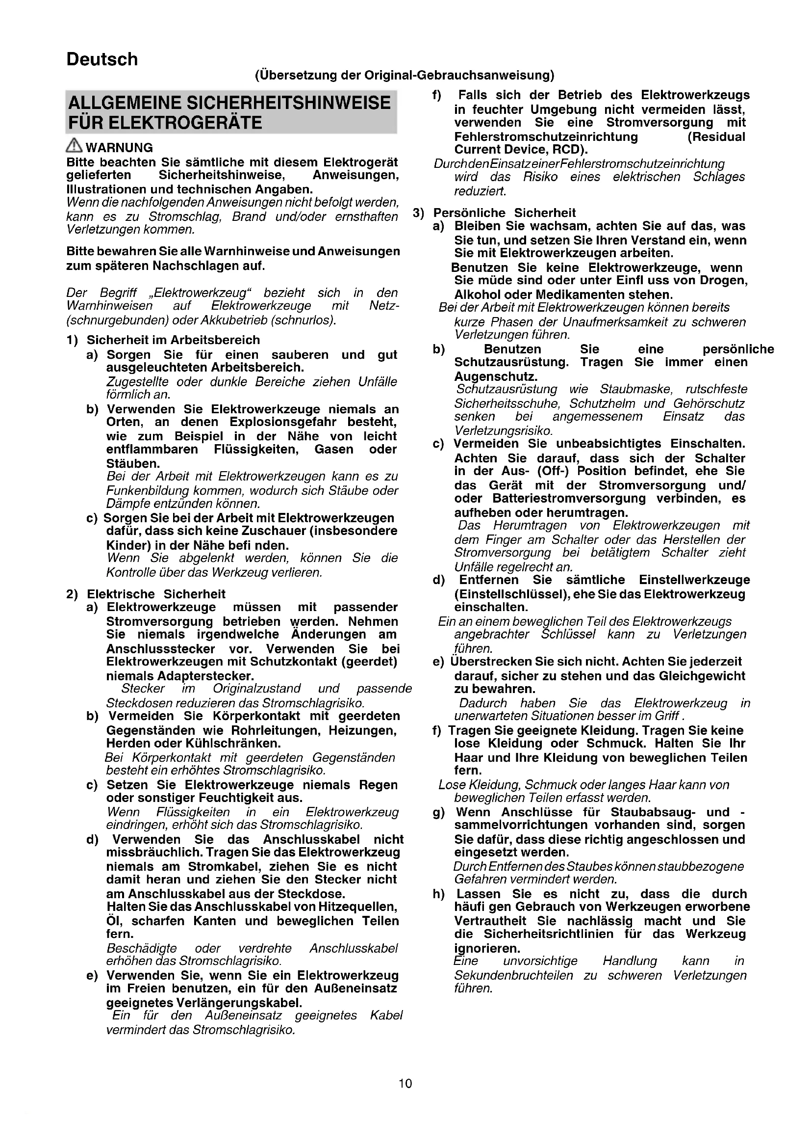 WARNUNG Bitte beachten Sie sämtliche mit diesem Elektrogerät gelieferten Sicherheitshinweise, Anweisungen, Illustrationen und technischen Angaben. Wenn die nachfolgenden Anweisungen nicht befolgt werden, kann es zu Stromschlag, Brand und/oder ernsthaften Verletzungen kommen. Bitte bewahren Sie alle Warnhinweise und Anweisungen zum späteren Nachschlagen auf. Der Begriff „Elektrowerkzeug“ bezieht sich in den Warnhinweisen auf Elektrowerkzeuge mit Netz- (schnurgebunden) oder Akkubetrieb (schnurlos).