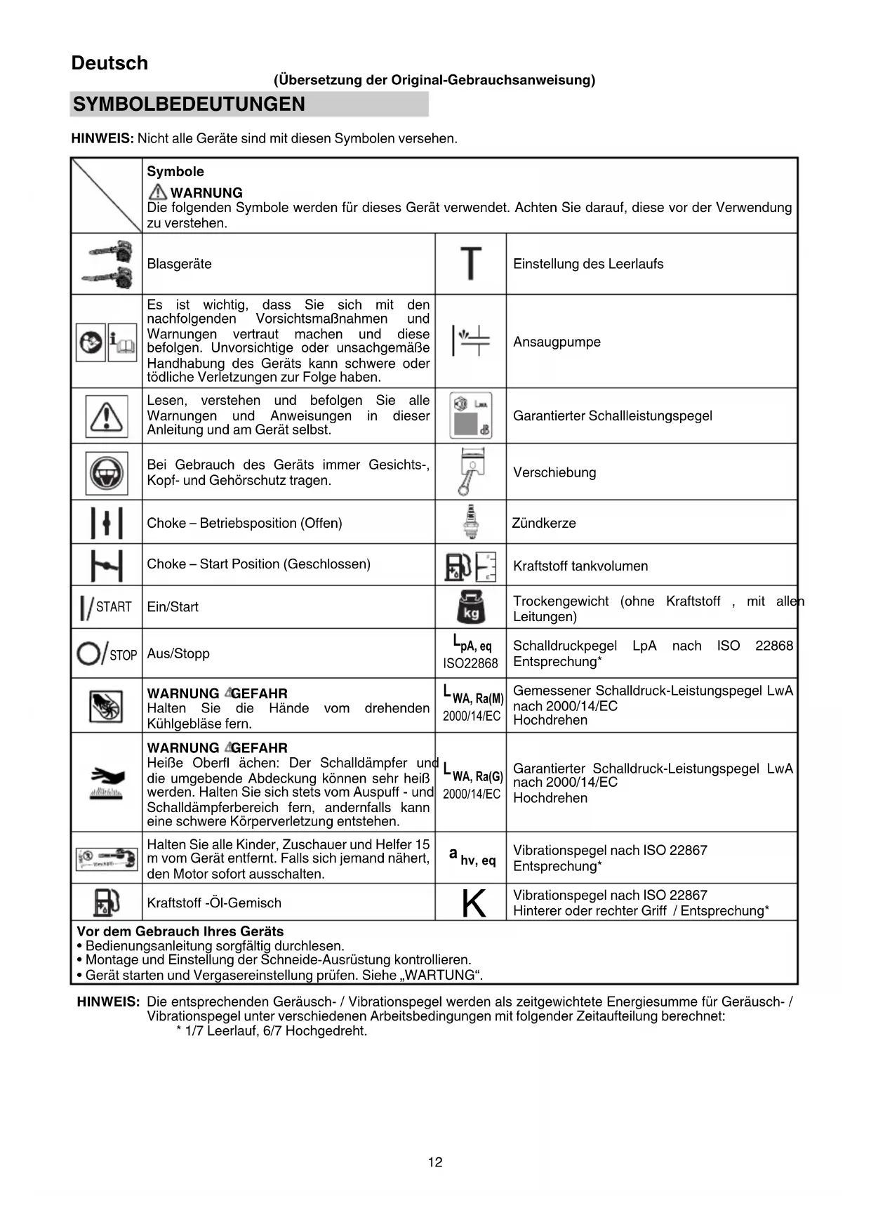 (Übersetzung der Original-Gebrauchsanweisung) SYMBOLBEDEUTUNGEN HINWEIS: Nicht alle Geräte sind mit diesen Symbolen versehen. Symbole WARNUNG Die folgenden Symbole werden für dieses Gerät verwendet. Achten Sie darauf, diese vor der Verwendung zu verstehen. Blasgeräte Einstellung des Leerlaufs Es ist wichtig, dass Sie sich mit den nachfolgenden Vorsichtsmaßnahmen und Warnungen vertraut machen und diese befolgen. Unvorsichtige oder unsachgemäße Handhabung des Geräts kann schwere oder tödliche Verletzungen zur Folge haben. Ansaugpumpe Lesen, verstehen und befolgen Sie alle Warnungen und Anweisungen in dieser Anleitung und am Gerät selbst. Garantierter Schallleistungspegel Bei Gebrauch des Geräts immer Gesichts-, Kopf- und Gehörschutz tragen. Verschiebung Choke – Betriebsposition (Off en) Zündkerze Choke – Start Position (Geschlossen) Kraftstoff tankvolumen START Ein/Start Trockengewicht (ohne Kraftstoff , mit allen Leitungen) STOP Aus/Stopp