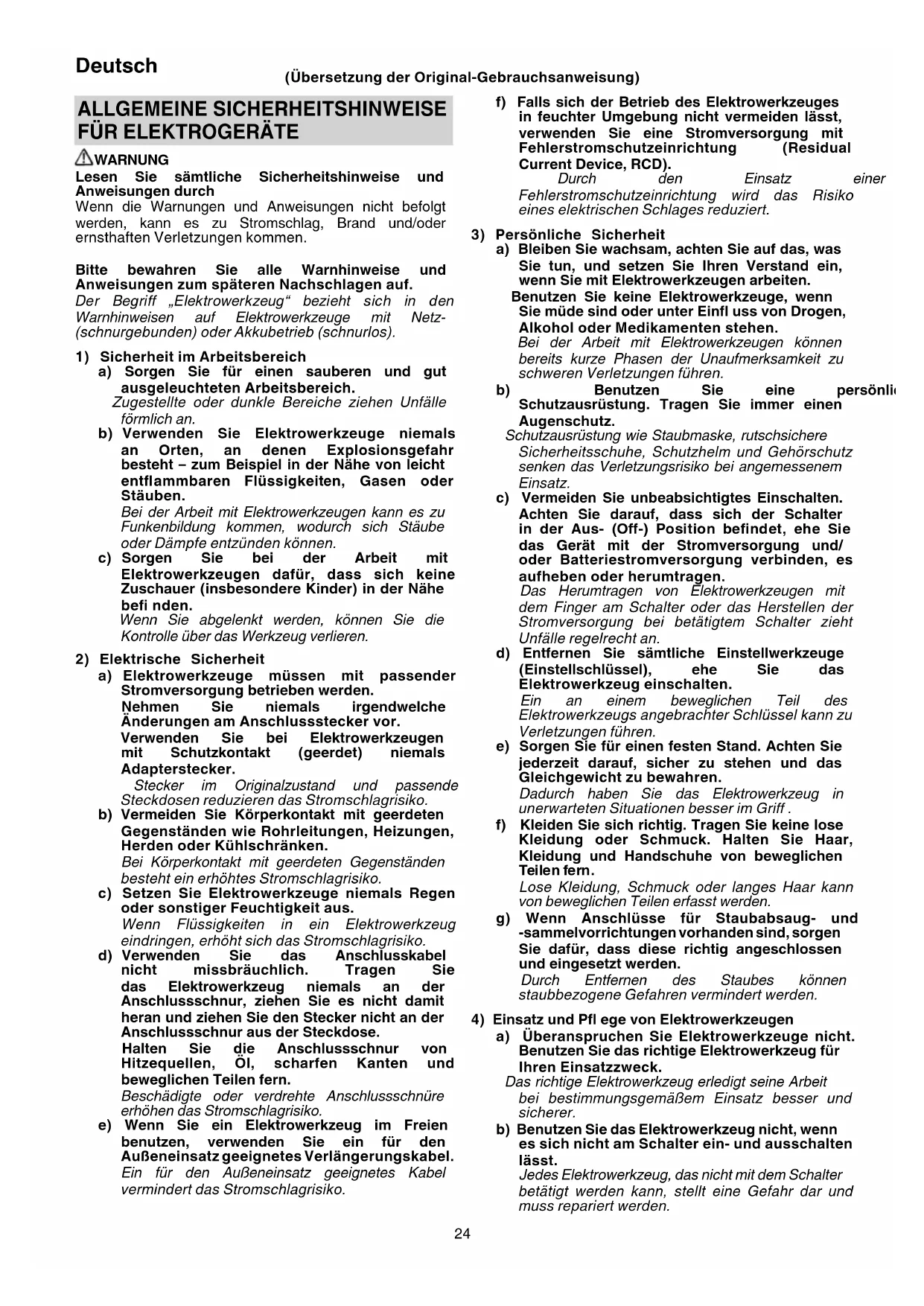 English 0000BookN14DSL.indb230000BookN14DSL.indb23 2021/10/2914:12:582021/10/2914:12:58(Übersetzung der Original-Gebrauchsanweisung) f) Falls sich der Betrieb des Elektrowerkzeuges in feuchter Umgebung nicht vermeiden lässt, verwenden Sie eine Stromversorgung mit Fehlerstromschutzeinrichtung (Residual Current Device, RCD). Durch den Einsatz einer Fehlerstromschutzeinrichtung wird das Risiko eines elektrischen Schlages reduziert.
