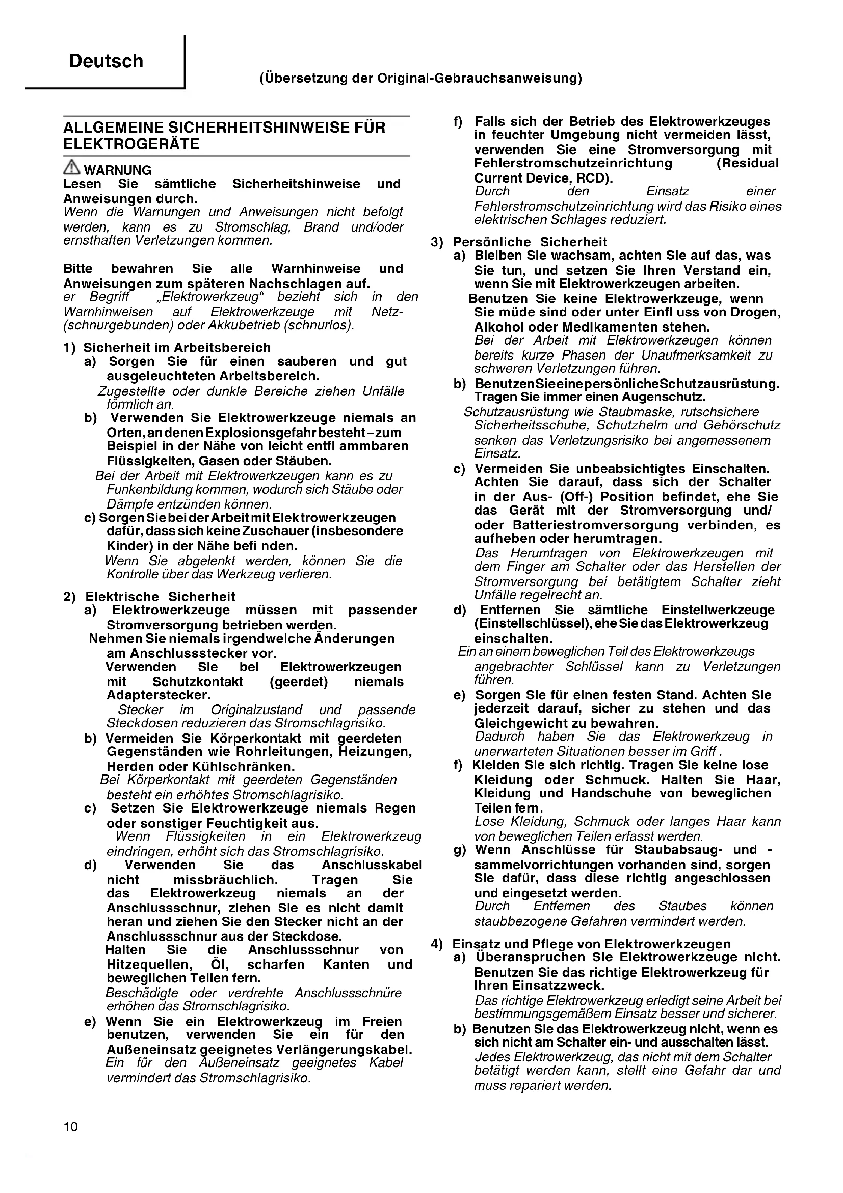 ELEKTROGERÄTE WARNUNG Lesen Sie sämtliche Sicherheitshinweise und Anweisungen durch. Wenn die Warnungen und Anweisungen nicht befolgt werden, kann es zu Stromschlag, Brand und/oder ernsthaften Verletzungen kommen. Bitte bewahren Sie alle Warnhinweise und Anweisungen zum späteren Nachschlagen auf. er Begriff „Elektrowerkzeug“ bezieht sich in den Warnhinweisen auf Elektrowerkzeuge mit Netz- (schnurgebunden) oder Akkubetrieb (schnurlos).