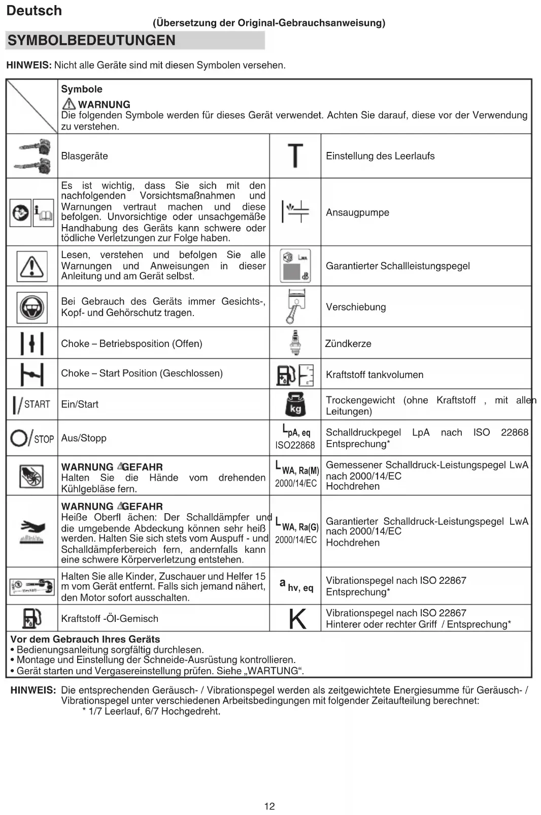 (Übersetzung der Original-Gebrauchsanweisung) SYMBOLBEDEUTUNGEN HINWEIS: Nicht alle Geräte sind mit diesen Symbolen versehen. Symbole WARNUNG Die folgenden Symbole werden für dieses Gerät verwendet. Achten Sie darauf, diese vor der Verwendung zu verstehen. Blasgeräte Einstellung des Leerlaufs Es ist wichtig, dass Sie sich mit den nachfolgenden Vorsichtsmaßnahmen und Warnungen vertraut machen und diese befolgen. Unvorsichtige oder unsachgemäße Handhabung des Geräts kann schwere oder tödliche Verletzungen zur Folge haben. Ansaugpumpe Lesen, verstehen und befolgen Sie alle Warnungen und Anweisungen in dieser Anleitung und am Gerät selbst. Garantierter Schallleistungspegel Bei Gebrauch des Geräts immer Gesichts-, Kopf- und Gehörschutz tragen. Verschiebung Choke – Betriebsposition (Off en) Zündkerze Choke – Start Position (Geschlossen) Kraftstoff tankvolumen START Ein/Start Trockengewicht (ohne Kraftstoff , mit allen Leitungen) STOP Aus/Stopp