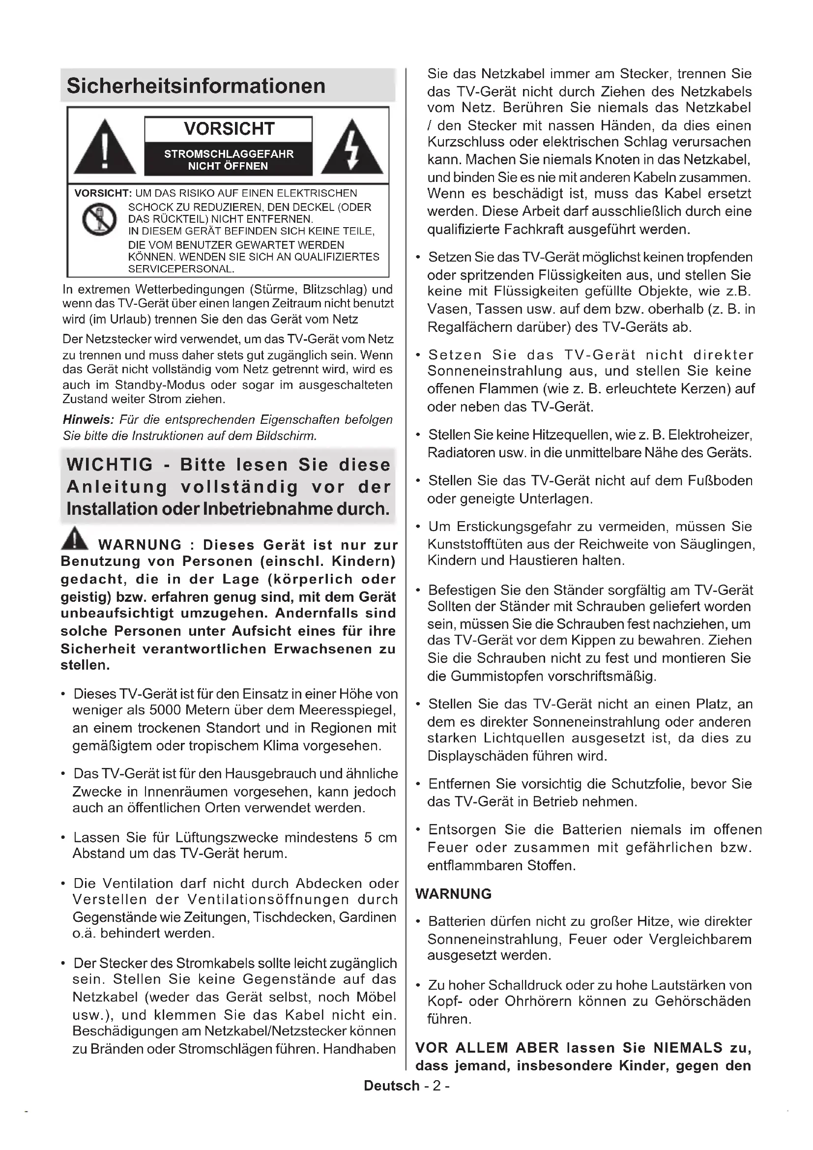 hersehbaren Betriebsbedin- gungen ungefährlich ist. WARNUNG Batterien dürfen nicht verschluckt werden, es besteht chemische Verätzungsgefahr. Dieses Gerät bzw. das zum Gerät mitgelieferte Zube- hör enthält möglicherweise eine Knopfzellenbatterie. Wenn die Knopfzellenbatterie verschluckt wird, führt dies innerhalb 2 Stunden zu schweren internen Ver- ätzungen mit möglicher Todesfolge. Halten Sie gebrauchte und neue Batterien von Kin- dern fern. Wenn das Batteriefach nicht sicher geschlossen ist, stoppen Sie die Verwendung des Geräts und halten Sie Kinder fern. Falls Sie den Verdacht haben, dass Batterien ver- schluckt wurden oder in irgendeinen Körperteil platziert wurde, suchen Sie sofort medizinische Hilfe auf. – – – – – – – – – – – – Warnung Stabilitätsgefahr Ein TV-Gerät kann umfallen und dabei ernste Ver- letzungen mit möglicher Todesfolge verursachen. Viele Verletzungen, insbesondere bei Kindern, können vermieden werden, wenn die folgenden einfachen