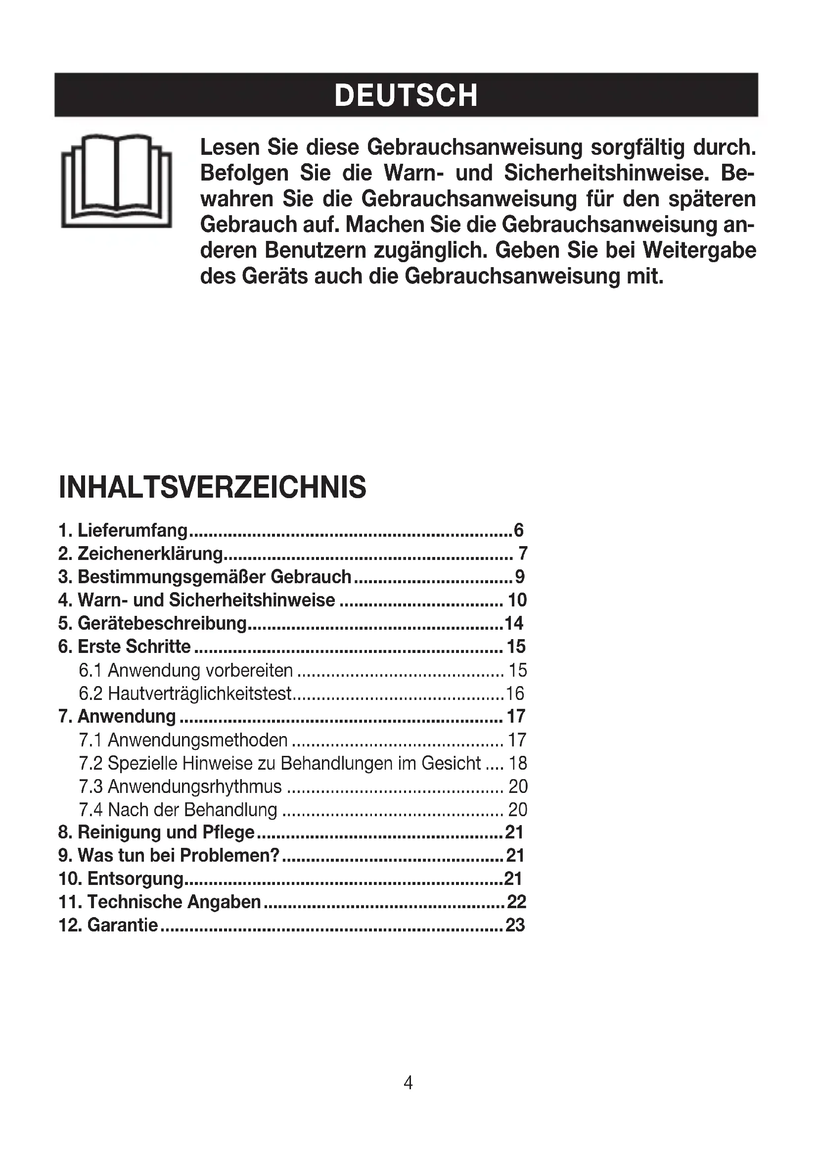 An einer Körperstelle, an der Sie später vielleicht behaart sein möchten. Diese Liste erhebt keinen Anspruch auf Vollständigkeit. Wenn Sie verschreibungspflichtige Medikamente einnehmen, auf- grund einer Krankheit regelmäßig kontrolliert werden und / oder nicht sicher sind, ob das Gerät für Sie sicher zu verwenden ist, konsultieren Sie zuerst Ihren Arzt oder Dermatologen bevor Sie das Gerät ver- wenden. Mögliche Nebenwirkungen: Wenn das Gerät entsprechend den Anweisungen in dieser Gebrauchsanweisung verwen- det wird, sind Nebenwirkungen und Komplikationen im Zusammenhang mit der Verwen- dung des Geräts selten.