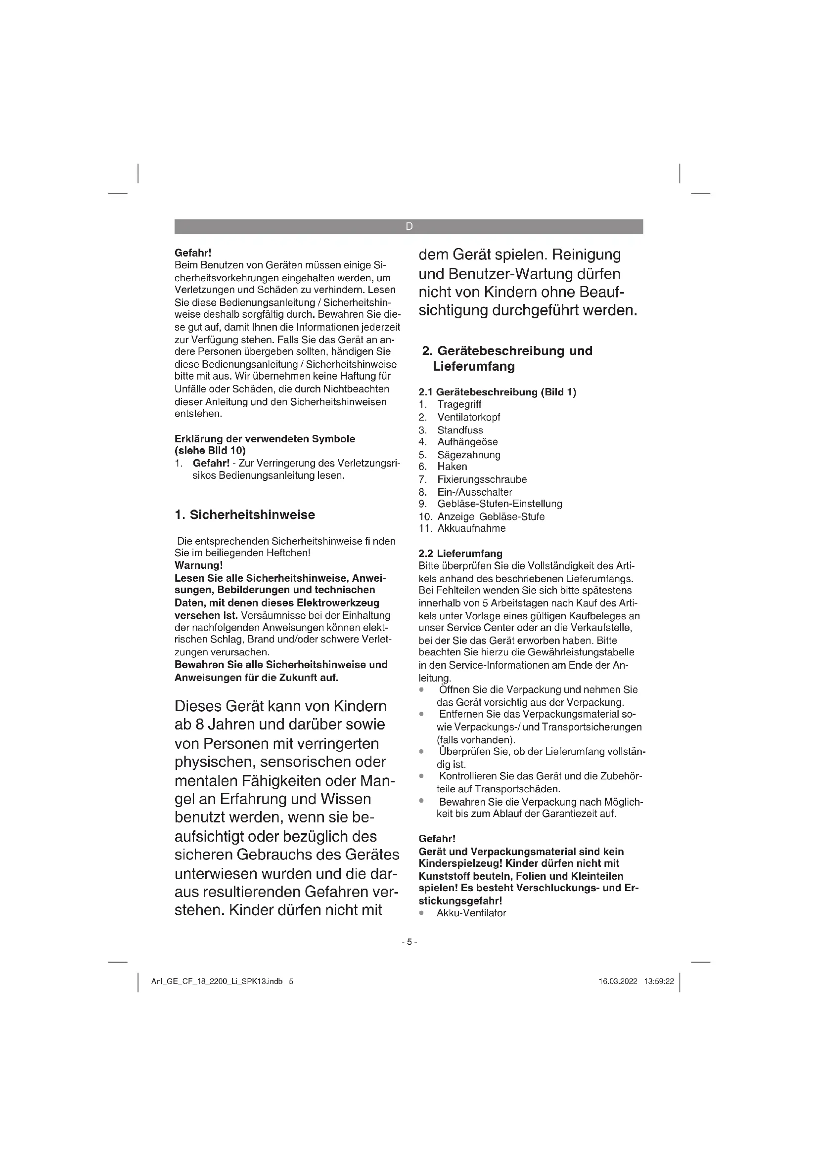 Der Akku-Ventilator schaltet dabei in der nied- rigsten Stufe ein. Anl_GE_CF_18_2200_Li_SPK13.indb 6Anl_GE_CF_18_2200_Li_SPK13.indb 6 16.03.2022 13:59:2216.03.2022 13:59:22D