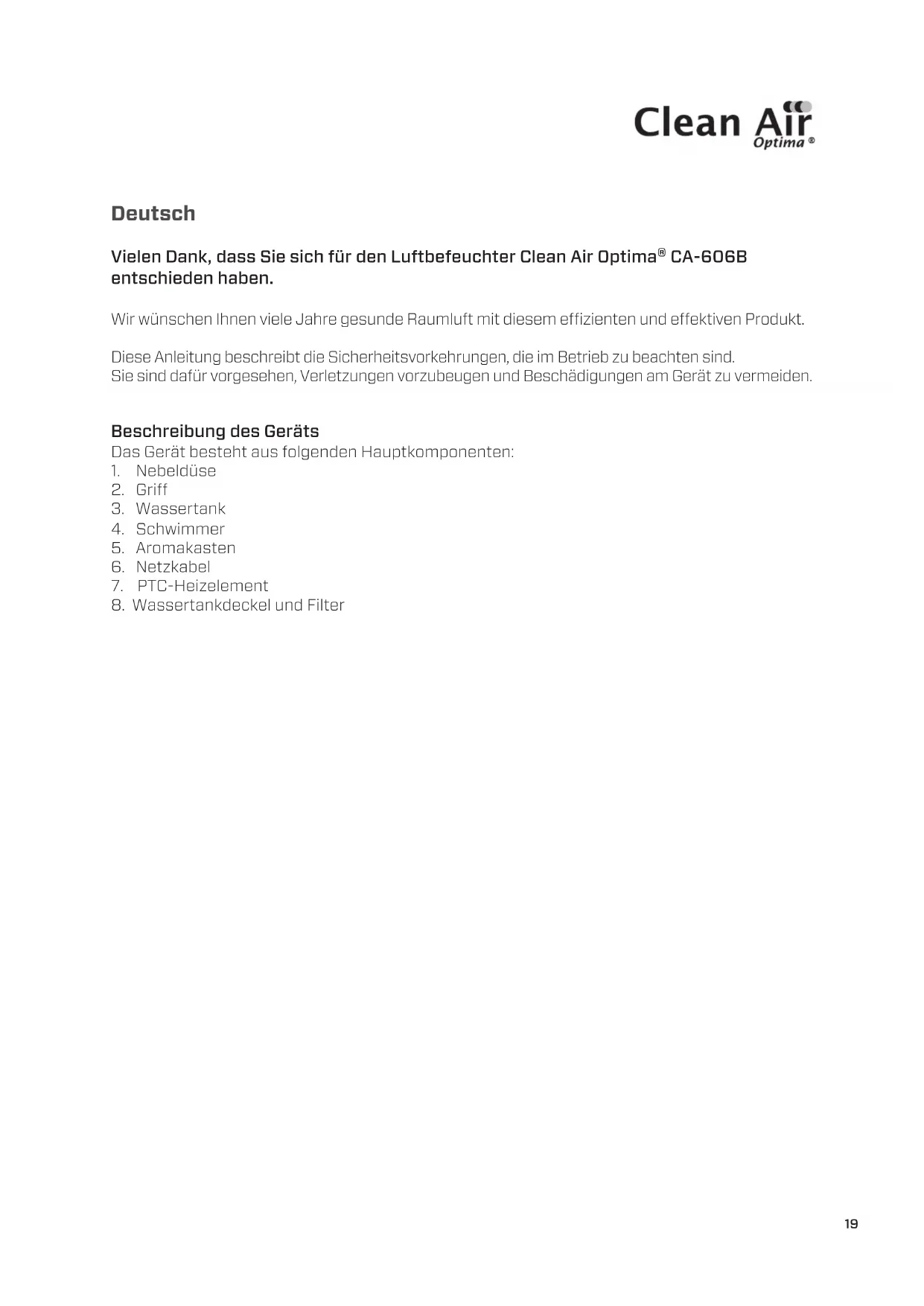 Clean Air Optima International B.V. | David Ricardostraat 9-7 / 9-9 | 7559 SH Hengelo (ov) The Netherlands | Phone: +31 (0) 74 - 2670145 Clean Air Optima Germany GmbH | Enschedestraße 14 | 48529 Nordhorn | Germany Phone: +49 (0) 5921 879-121 E-mail: info@cleanairoptima.com Internet: www.cleanairoptima.com19 Deutsch Vielen Dank, dass Sie sich für den Luftbefeuchter Clean Air Optima® CA-606B entschieden haben. Wir wünschen Ihnen viele Jahre gesunde Raumluft mit diesem ezienten und eektiven Produkt. Diese Anleitung beschreibt die Sicherheitsvorkehrungen, die im Betrieb zu beachten sind. Sie sind dafür vorgesehen, Verletzungen vorzubeugen und Beschädigungen am Gerät zu vermeiden. Beschreibung des Geräts Das Gerät besteht aus folgenden Hauptkomponenten: