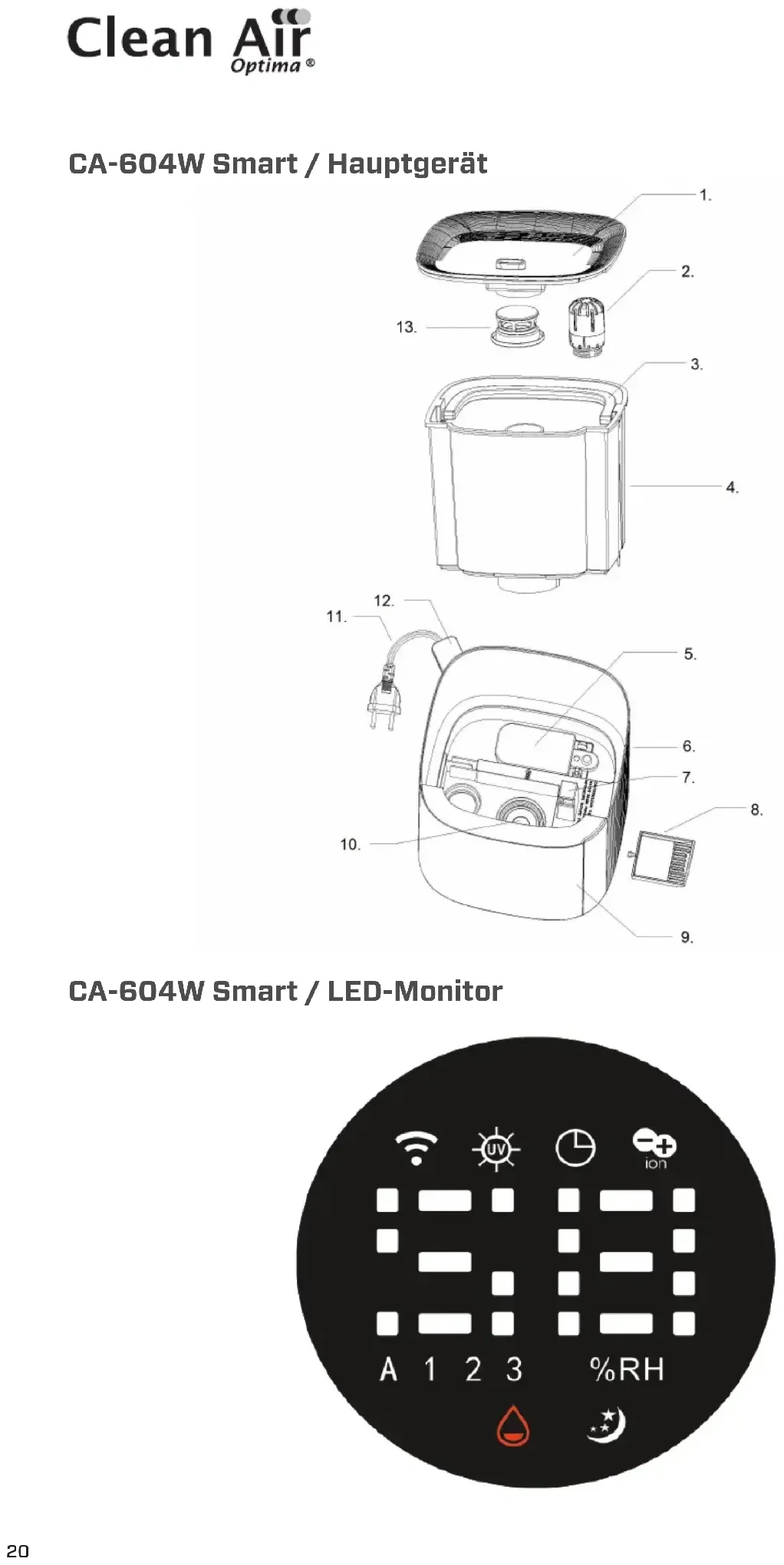 CA-604W Smart / LED-Monitor21 Deutsch Vielen Dank, dass Sie sich für den Luftbefeuchter Clean Air Optima CA-604W® Smart entschieden haben. Wir wünschen Ihnen viele Jahre gesunde Raumluft mit diesem ezienten und eektiven Produkt. Diese Anleitung beschreibt die Sicherheitsvorkehrungen, die im Betrieb zu beachten sind. Sie sind dafür vorgesehen, Verletzungen vorzubeugen und Beschädigungen am Gerät zu vermeiden. Beschreibung des Geräts: Das Gerät besteht aus folgenden Hauptkomponenten:
