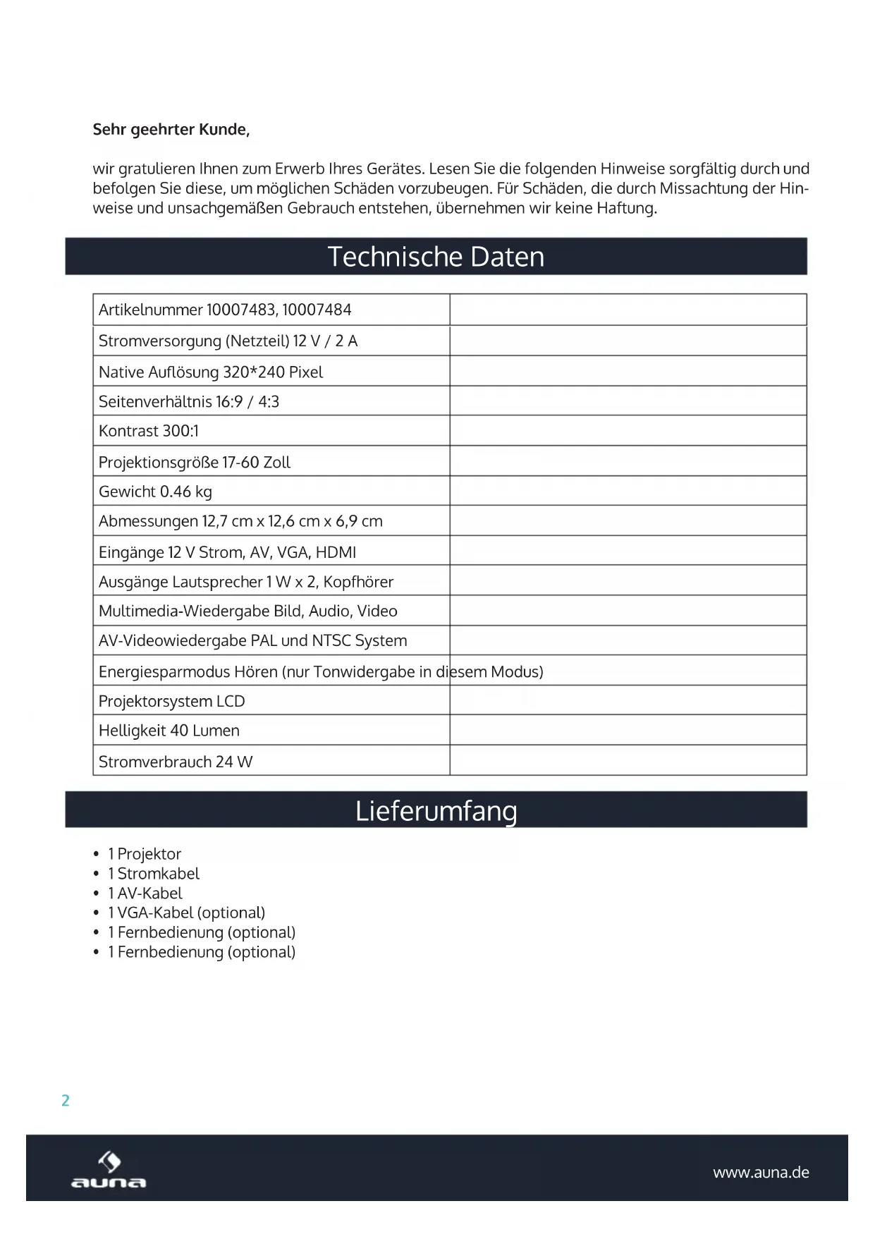 Mini-Beamer | VGA | AV LED-Projektor2 www.auna.de Sehr geehrter Kunde, wir gratulieren Ihnen zum Erwerb Ihres Gerätes. Lesen Sie die folgenden Hinweise sorgfältig durch und befolgen Sie diese, um möglichen Schäden vorzubeugen. Für Schäden, die durch Missachtung der Hin- weise und unsachgemäßen Gebrauch entstehen, übernehmen wir keine Haftung. Technische Daten Artikelnummer 10007483, 10007484 Stromversorgung (Netzteil) 12 V / 2 A Native Auösung 320*240 Pixel Seitenverhältnis 16:9 / 4:3 Kontrast 300:1 Projektionsgröße 17-60 Zoll Gewicht 0.46 kg Abmessungen 12,7 cm x 12,6 cm x 6,9 cm Eingänge 12 V Strom, AV, VGA, HDMI Ausgänge Lautsprecher 1 W x 2, Kopfhörer Multimedia-Wiedergabe Bild, Audio, Video AV-Videowiedergabe PAL und NTSC System Energiesparmodus Hören (nur Tonwidergabe in diesem Modus) Projektorsystem LCD Helligkeit 40 Lumen Stromverbrauch 24 W Lieferumfang