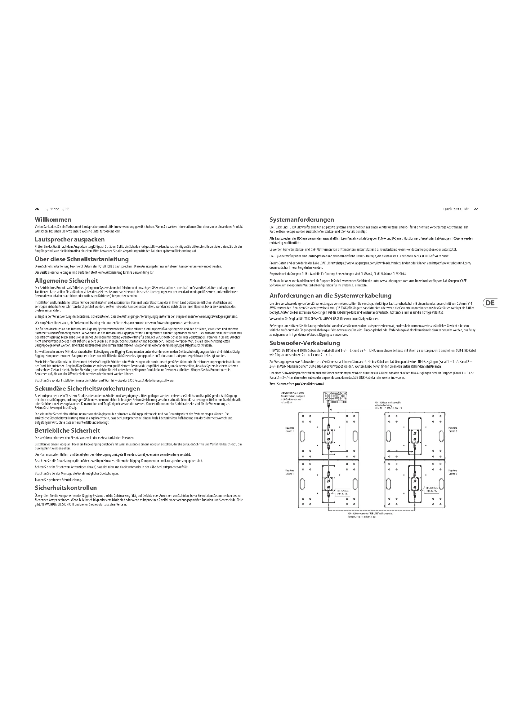 Front Input SUB + Not Connected Not Connected Front Input SUB - Suspension et application de simulation acoustique L’enceinte TQ15B TQ18B ne peut pas être placée dans un array, mais elle apparait cependant dans Ease Focus 3, un programme de simulation acoustique, disponible gratuitement en téléchargement sur https://www.afmg.eu/en/ease-focus24 TQ15B and TQ18B Quick Start Guide 25 Installation Avertissement de sécurité: seules les personnes autorisées et certiées sont en mesure de concevoir et d’installer des systèmes suspendus. Une installation non conforme peut provoquer des blessures permanentes voire même la mort. L'utilisation d'une sécurité secondaire est une exigence de sécurité obligatoire si vous installez ce produit avec les points d'accrochage M10. The TQ15B/TQ18B L’enceinte TQ est très polyvalente : elle est dotée de pieds sur sa face inférieure pour être placée sur une surface plate, de 2 embases de montage sur barre et d’embases de xation M10 avec vis à six pans. Pole Mount Feet Empilement au sol Le TQ15B/TQ18B peut être empilé au sol dans l'orientation horizontale ou verticale. Dans l'orientation verticale, essayez d'en monter deux avec les ports l'un à côté de l'autre, comme illustré. Des sangles de raquette appropriées enroulées autour du groupe d'armoires sont conseillées comme mesure de sécurité supplémentaire. Rotation du logo Le logo Turbosound est monté sur ressort et peut être orienté à la main en fonction du positionnement vertical ou horizontal de l’enceinte. Suspension Les enceintes TQ sont dotées de plusieurs points de xation an de pouvoir s’intégrer à la plupart des installations permanentes. Elles peuvent être suspendues en utilisant des boulons à œil M10 à visser dans les points de suspension de l’enceinte. Retirez les vis à tête fraisée en place et remplacez-les par des boulons à œil avec tige letée d’au moins 40 mm. Les enceintes peuvent être suspendues à l’envers si nécessaire. Rigging Points Eyebolts M10 Shoulder Eyebolt 40 mm Montage sur poteau Deux trous de 35 mm sont prévus pour le montage sur poteau. Nous recommandons d’utiliser une barre de 35 mm avec letage M20 à l’extrémité inférieure. Ce type de barre ore un plus haut niveau de sécurité et peut être vissée dans l’embase située sur le dessus du subwoofer. Roues de transport (option) Un kit en option permet de monter quatre roues comme indiqué. Remarques sur l’application Lake et les presets Toutes les enceintes de la série TQ doivent être utilisés uniquement avec des presets LAKE et des amplis Lab Gruppen PLM+ et L de la série D ainsi que les preset IPX FiR-X (à paraitre prochainement). Aucun autre ampli ou plateforme DSP n’est compatible Les appareils de la série TQ disposent d’une structure simple et puissante de presets basés sur les dernières fonctionnalités du logiciel Lake et sur les presets BLEQ. Les presets peuvent être obtenus depuis la bibliothèque Lake Load ou téléchargés sur www.turbosound.com Les subwoofers TQ15B et TQ18B disposent toutes de preset FIR passif à 1 voie (1 canal DSP/AMP). ATTENTION : ne combinez jamais plusieurs subwoofers TQ15B et TQ18B avec le même ampli/circuit DSP. Le non-respect de cette indication peut endommager votre équipement. ATTENTION : Portez une attention particulière au câblage en sortie. Les modules des TQ15B et TQ18B sont basés sur le module XP de l’application Lake. Ce guide se réfère à la version REV1.1 des presets XP. La version 7.0.7 ou supérieure de l’application Lake doit être utilisée. Chemin du signal de Lake XP : Le chier de téléchargement du contrôleur Lake contient également un tutoriel complet sur l’application Lake Controller et les appareils compatibles comme les amplis de la série PLM+ Dans ce guide, nous nous concentrerons sur le fonctionnement et les presets des appareils de la série Turbosound TQ. Une connaissance basique du logiciel Lake Controller est nécessaire.26 TQ15B and TQ18B Quick Start Guide 27 Willkommen Vielen Dank, dass Sie ein Turbosound-Lautsprecherprodukt für Ihre Anwendung gewählt haben. Wenn Sie weitere Informationen über dieses oder ein anderes Produkt wünschen, besuchen Sie bitte unsere Website unter turbosound.com. Lautsprecher auspacken Prüfen Sie das Gerät nach dem Auspacken sorgfältig auf Schäden. Sollte ein Schaden festgestellt werden, benachrichtigen Sie bitte sofort Ihren Lieferanten. Sie als der Empfänger müssen die Reklamation einleiten. Bitte bewahren Sie alle Verpackungen für den Fall einer späteren Rücksendung auf. Über diese Schnellstartanleitung Diese Schnellstartanleitung beschreibt Details des TQ15B TQ18B Lautsprechers. Diese Anleitung darf nur mit diesen Komponenten verwendet werden. Der Besitz dieser Anleitungen und Verfahren stellt keine Autorisierung für ihre Verwendung dar. Allgemeine Sicherheit Der Betrieb Ihres Produkts als Teil eines geogenen Systems kann bei falscher und unsachgemäßer Installation zu ernsthaften Gesundheitsrisiken und sogar zum Tod führen. Bitte stellen Sie außerdem sicher, dass elektrische, mechanische und akustische Überlegungen vor der Installation mit qualiziertem und zertiziertem Personal (von lokalen, staatlichen oder nationalen Behörden) besprochen werden. Installation und Einrichtung sollten nur von qualiziertem und autorisiertem Personal unter Beachtung der in Ihrem Land geltenden örtlichen, staatlichen und sonstigen Sicherheitsvorschriften durchgeführt werden. Sollten Teile oder Komponenten fehlen, wenden Sie sich bitte an Ihren Händler, bevor Sie versuchen, das System einzurichten. Es liegt in der Verantwortung des Monteurs, sicherzustellen, dass die Aufhängungs-/Befestigungspunkte für den vorgesehenen Verwendungszweck geeignet sind. Wir empfehlen Ihnen auch, ein Turbosound-Training mit unseren Vertriebspartnern und unserem Anwendungsteam zu vereinbaren. Die für den Anschluss an das Turbosound-Rigging-System v
