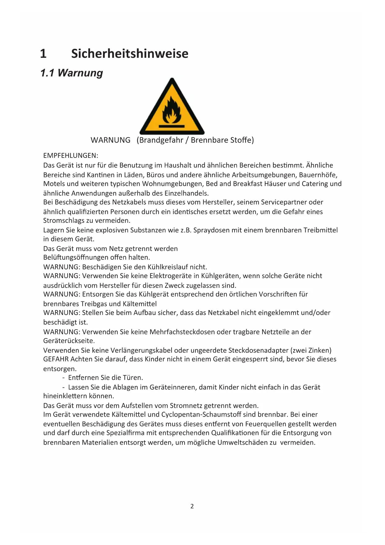 Das Gerät ist nur für die Benutzung im Haushalt und ähnlichen Bereichen besmmt. Ähnliche Bereiche sind Kannen in Läden, Büros und andere ähnliche Arbeitsumgebungen, Bauernhöfe, Motels und weiteren typischen Wohnumgebungen, Bed and Breakfast Häuser und Catering und ähnliche Anwendungen außerhalb des Einzelhandels. Bei Beschädigung des Netzkabels muss dieses vom Hersteller, seinem Servicepartner oder ähnlich qualifizierten Personen durch ein idensches ersetzt werden, um die Gefahr eines Stromschlags zu vermeiden. Lagern Sie keine explosiven Substanzen wie z.B. Spraydosen mit einem brennbaren Treibmiel in diesem Gerät. Das Gerät muss vom Netz getrennt werden Belüungsöffnungen offen halten. WARNUNG: Beschädigen Sie den Kühlkreislauf nicht. WARNUNG: Verwenden Sie keine Elektrogeräte in Kühlgeräten, wenn solche Geräte nicht ausdrücklich vom Hersteller für diesen Zweck zugelassen sind. WARNUNG: Entsorgen Sie das Kühlgerät entsprechend den örtlichen Vorschrien für brennbares Treibgas und Kältemiel WARNUNG: Stellen Sie beim Auau sicher, dass das Netzkabel nicht eingeklemmt und/oder beschädigt ist. WARNUNG: Verwenden Sie keine Mehrfachsteckdosen oder tragbare Netzteile an der Geräterückseite. Verwenden Sie keine Verlängerungskabel oder ungeerdete Steckdosenadapter (zwei Zinken) GEFAHR Achten Sie darauf, dass Kinder nicht in einem Gerät eingesperrt sind, bevor Sie dieses entsorgen. - Enernen Sie die Türen. - Lassen Sie die Ablagen im Geräteinneren, damit Kinder nicht einfach in das Gerät hineinkleern können. Das Gerät muss vor dem Aufstellen vom Stromnetz getrennt werden. Im Gerät verwendete Kältemiel und Cyclopentan-Schaumstoff sind brennbar. Bei einer eventuellen Beschädigung des Gerätes muss dieses enernt von Feuerquellen gestellt werden und darf durch eine Spezialfirma mit entsprechenden Qualifikaonen für die Entsorgung von brennbaren Materialien entsorgt werden, um mögliche Umweltschäden zu vermeiden.3 EN Standard: Dieses Gerät darf von Kindern ab 8 Jahren und durch Personen mit eingeschränkten physischen, sensorischen oder geisgen Fähigkeiten nur benutzt werden, wenn sie durch eine für ihre Sicherheit zuständige Person beaufsichgt oder von ihr Anweisungen, wie das Gerät zu benutzen ist, erhalten haben. Kinder dürfen nicht mit dem Gerät spielen. Die Reinigung und Wartung durch den Benutzer darf von Kindern ohne Aufsicht nicht durchgeführt werden. IEC Standard: Dieses Gerät darf durch Personen mit eingeschränkten physischen, sensorischen oder geisgen Fähigkeiten (einschließlich Kindern) nur benutzt werden, wenn sie durch eine für ihre Sicherheit zuständige Person beaufsichgt werden oder von ihr Anweisungen, wie das Gerät zu benutzen ist, erhalten haben. Kinder müssen beaufsichgt werden, damit sie nicht mit dem Gerät spielen.Dieses Benutzerhandbuch enthält viele Sicherheitsinformationen, die vom Benutzer beachtets werden müssen. Ziehen Sie den Stecker nie am Kabel aus der Steckdose. Bitte umfassen Sie den Stecker fest und ziehen Sie diesen direkt aus der Steckdose. Beschädigen Sie das Kabel nicht und benutzen Sie kein beschädigtes oder kaputtes Kabel. Benutzen Sie für den Anschluss des Kühlsgeräts nur eine ordnungsgemäß geerdete Steckdose. Stellen Sie keine anderen Elektrogeräte auf das Kühlgerät, außer, wenn solche Geräte ausdrücklich vom Hersteller für diesen Zweck zugelassen sind. Bitte schalten Sie das Ventil des austretenden Gases aus und öffnen Sie dann die Türen und Fenster, falls Gas und andere brennbare Gase austreten. Ziehen Sie den Stecker des Kühlschranks und anderer elektrischer Geräte nicht heraus, da ein Funke einen Brand verursachen kann. Schließen Sie das Gerät nur mit einer eigenen Steckdose an. Mehrfachsteckdosen, die den Anschluss auf mehrere Geräte aufteilen sind nicht gestattet. Zur Vermeidung von Brandgefahr muss der Stecker fest in der Steckdose sitzen.