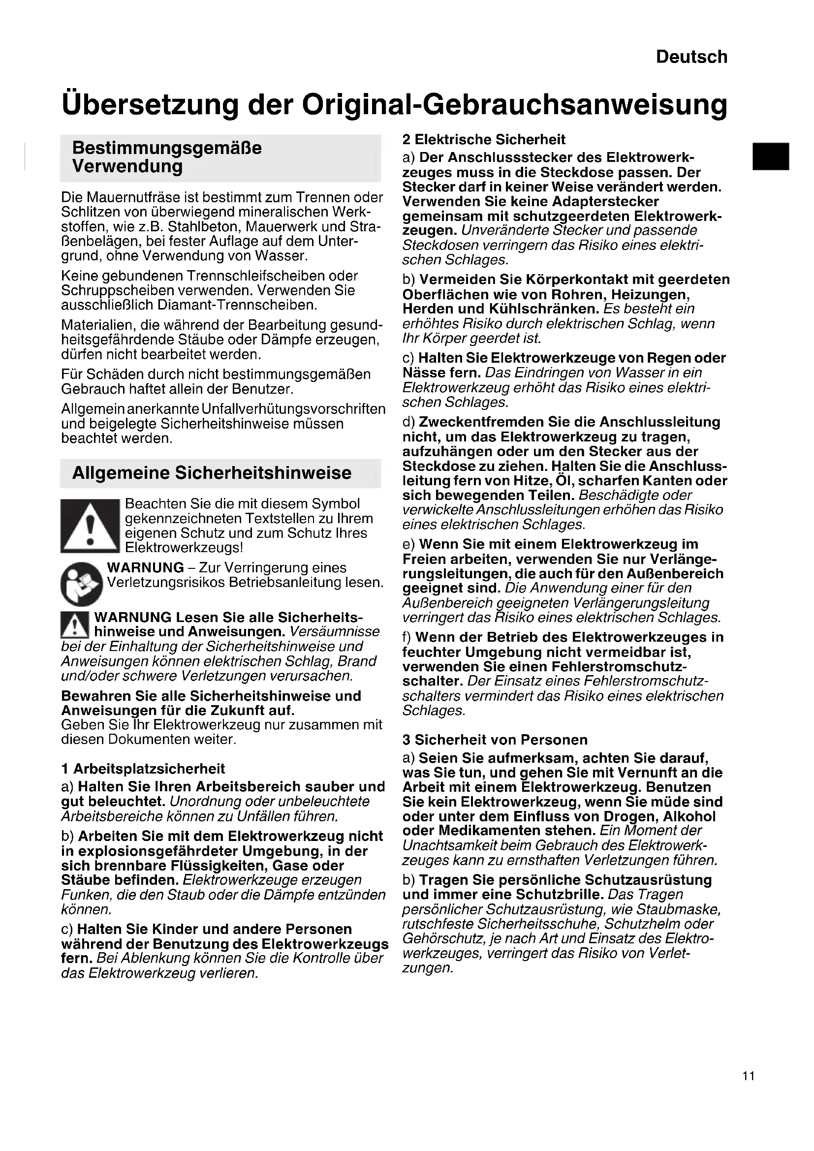 Übersetzung der Original-Gebrauchsanweisung Die Mauernutfräse ist bestimmt zum Trennen oder Schlitzen von überwiegend mineralischen Werk- stoffen, wie z.B. Stahlbeton, Mauerwerk und Stra- ßenbelägen, bei fester Auflage auf dem Unter- grund, ohne Verwendung von Wasser. Keine gebundenen Trennschleifscheiben oder Schruppscheiben verwenden. Verwenden Sie ausschließlich Diamant-Trennscheiben. Materialien, die während der Bearbeitung gesund- heitsgefährdende Stäube oder Dämpfe erzeugen, dürfen nicht bearbeitet werden. Für Schäden durch nicht bestimmungsgemäßen Gebrauch haftet allein der Benutzer. Allgemein anerkannte Unfallverhütungsvorschriften und beigelegte Sicherheitshinweise müssen beachtet werden. Beachten Sie die mit diesem Symbol gekennzeichneten Textstellen zu Ihrem eigenen Schutz und zum Schutz Ihres Elektrowerkzeugs! WARNUNG – Zur Verringerung eines Verletzungsrisikos Betriebsanleitung lesen. WARNUNG Lesen Sie alle Sicherheits- hinweise und Anweisungen. Versäumnisse bei der Einhaltung der Sicherheitshinweise und Anweisungen können elektrischen Schlag, Brand und/oder schwere Verletzungen verursachen. Bewahren Sie alle Sicherheitshinweise und Anweisungen für die Zukunft auf. Geben Sie Ihr Elektrowerkzeug nur zusammen mit diesen Dokumenten weiter. 1 Arbeitsplatzsicherheit a) Halten Sie Ihren Arbeitsbereich sauber und gut beleuchtet. Unordnung oder unbeleuchtete Arbeitsbereiche können zu Unfällen führen. b) Arbeiten Sie mit dem Elektrowerkzeug nicht in explosionsgefährdeter Umgebung, in der sich brennbare Flüssigkeiten, Gase oder Stäube befinden. Elektrowerkzeuge erzeugen Funken, die den Staub oder die Dämpfe entzünden können. c) Halten Sie Kinder und andere Personen während der Benutzung des Elektrowerkzeugs fern. Bei Ablenkung können Sie die Kontrolle über das Elektrowerkzeug verlieren. 2 Elektrische Sicherheit a) Der Anschlussstecker des Elektrowerk- zeuges muss in die Steckdose passen. Der Stecker darf in keiner Weise verändert werden. Verwenden Sie keine Adapterstecker gemeinsam mit schutzgeerdeten Elektrowerk- zeugen. Unveränderte Stecker und passende Steckdosen verringern das Risiko eines elektri- schen Schlages. b) Vermeiden Sie Körperkontakt mit geerdeten Oberflächen wie von Rohren, Heizungen, Herden und Kühlschränken. Es besteht ein erhöhtes Risiko durch elektrischen Schlag, wenn Ihr Körper geerdet ist. c) Halten Sie Elektrowerkzeuge von Regen oder Nässe fern. Das Eindringen von Wasser in ein Elektrowerkzeug erhöht das Risiko eines elektri- schen Schlages. d) Zweckentfremden Sie die Anschlussleitung nicht, um das Elektrowerkzeug zu tragen, aufzuhängen oder um den Stecker aus der Steckdose zu ziehen. Halten Sie die Anschluss- leitung fern von Hitze, Öl, scharfen Kanten oder sich bewegenden Teilen. Beschädigte oder verwickelte Anschlussleitungen erhöhen das Risiko eines elektrischen Schlages. e) Wenn Sie mit einem Elektrowerkzeug im Freien arbeiten, verwenden Sie nur Verlänge- rungsleitungen, die auch für den Außenbereich geeignet sind. Die Anwendung einer für den Außenbereich geeigneten Verlängerungsleitung verringert das Risiko eines elektrischen Schlages. f) Wenn der Betrieb des Elektrowerkzeuges in feuchter Umgebung nicht vermeidbar ist, verwenden Sie einen Fehlerstromschutz- schalter. Der Einsatz eines Fehlerstromschutz- schalters vermindert das Risiko eines elektrischen Schlages. 3 Sicherheit von Personen
