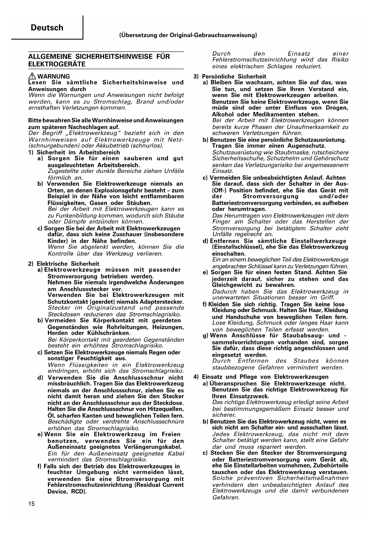 ELEKTROGERÄTE WARNUNG Lesen Sie sämtliche Sicherheitshinweise und Anweisungen durch Wenn die Warnungen und Anweisungen nicht befolgt werden, kann es zu Stromschlag, Brand und/oder ernsthaften Verletzungen kommen. Bitte bewahren Sie alle Warnhinweise und Anweisungen zum späteren Nachschlagen auf. Der Begriff „Elektrowerkzeug“ bezieht sich in den Warnhinweisen auf Elektrowerkzeuge mit Netz- (schnurgebunden) oder Akkubetrieb (schnurlos).