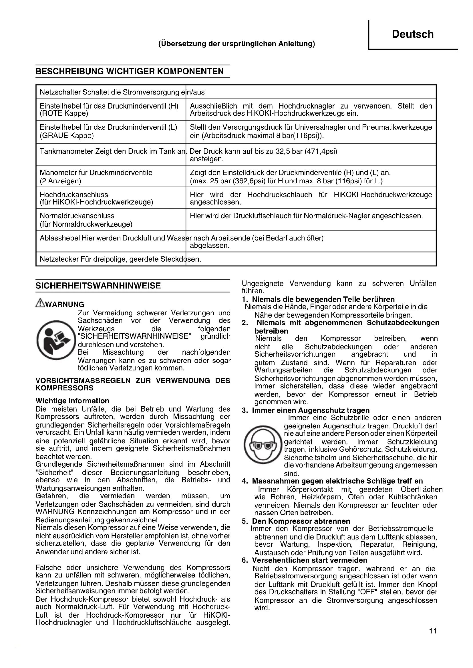 Netzschalter Schaltet die Stromversorgung ein/aus Einstellhebel für das Druckminderventil (H) (ROTE Kappe) Ausschließlich mit dem Hochdrucknagler zu verwenden. Stellt den Arbeitsdruck des HiKOKI-Hochdruckwerkzeugs ein. Einstellhebel für das Druckminderventil (L) (GRAUE Kappe) Stellt den Versorgungsdruck für Universalnagler und Pneumatikwerkzeuge ein (Arbeitsdruck maximal 8 bar(116psi)). Tankmanometer Zeigt den Druck im Tank an. Der Druck kann auf bis zu 32,5 bar (471,4psi) ansteigen. Manometer für Druckminderventile (2 Anzeigen) Zeigt den Einstelldruck der Druckminderventile (H) und (L) an. (max. 25 bar (362,6psi) für H und max. 8 bar (116psi) für L.) Hochdruckanschluss (für HiKOKI-Hochdruckwerkzeuge) Hier wird der Hochdruckschlauch für HiKOKI-Hochdruckwerkzeuge angeschlossen. Normaldruckanschluss (für Normaldruckwerkzeuge) Hier wird der Druckluftschlauch für Normaldruck-Nagler angeschlossen. Ablasshebel Hier werden Druckluft und Wasser nach Arbeitsende (bei Bedarf auch öfter) abgelassen. Netzstecker Für dreipolige, geerdete Steckdosen. SICHERHEITSWARNHINWEISE WARNUNG Zur Vermeidung schwerer Verletzungen und Sachschäden vor der Verwendung des Werkzeugs die folgenden "SICHERHEITSWARNHINWEISE" gründlich durchlesen und verstehen. Bei Missachtung der nachfolgenden Warnungen kann es zu schweren oder sogar tödlichen Verletzungen kommen.