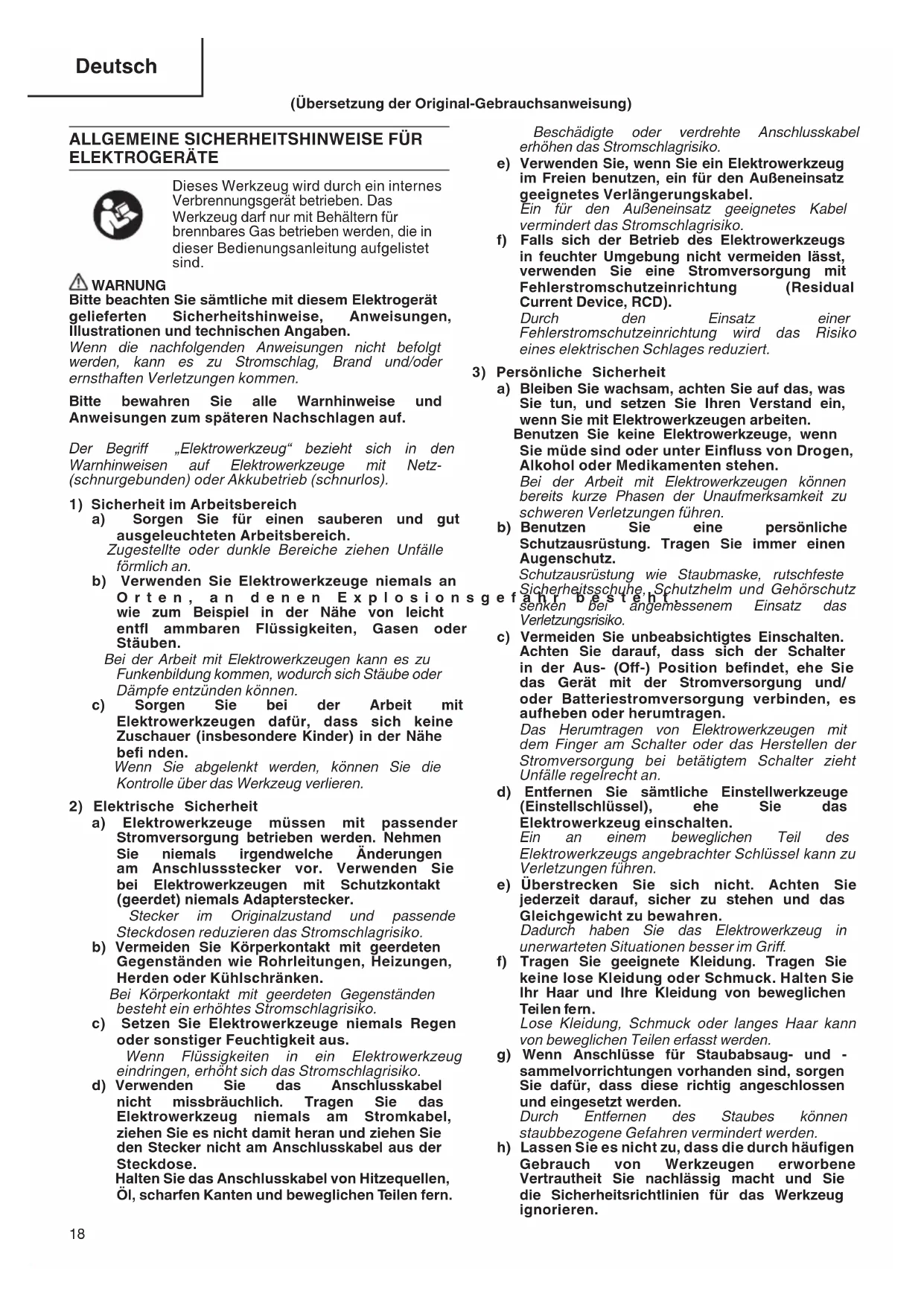 ELEKTROGERÄTE Dieses Werkzeug wird durch ein internes Verbrennungsgerät betrieben. Das Werkzeug darf nur mit Behältern für brennbares Gas betrieben werden, die in dieser Bedienungsanleitung aufgelistet sind. WARNUNG Bitte beachten Sie sämtliche mit diesem Elektrogerät gelieferten Sicherheitshinweise, Anweisungen, Illustrationen und technischen Angaben. Wenn die nachfolgenden Anweisungen nicht befolgt werden, kann es zu Stromschlag, Brand und/oder ernsthaften Verletzungen kommen. Bitte bewahren Sie alle Warnhinweise und Anweisungen zum späteren Nachschlagen auf. Der Begriff „Elektrowerkzeug“ bezieht sich in den Warnhinweisen auf Elektrowerkzeuge mit Netz- (schnurgebunden) oder Akkubetrieb (schnurlos).