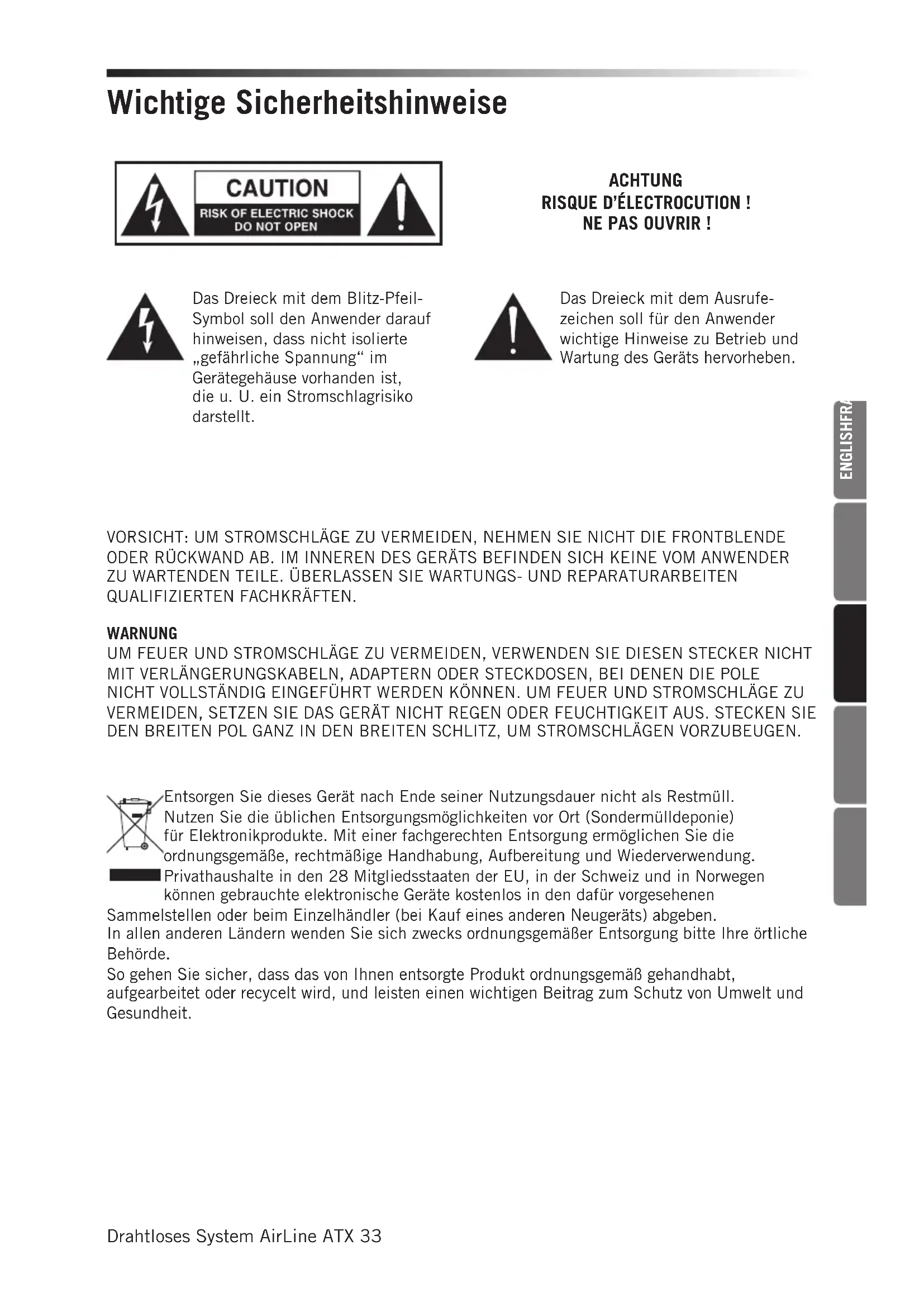 Batterien) dürfen niemals großer Hitze wie direktem Sonnenlicht, Feuer oder ähnlichem ausgesetzt werden.Drahtloses System AirLine ATX 35
