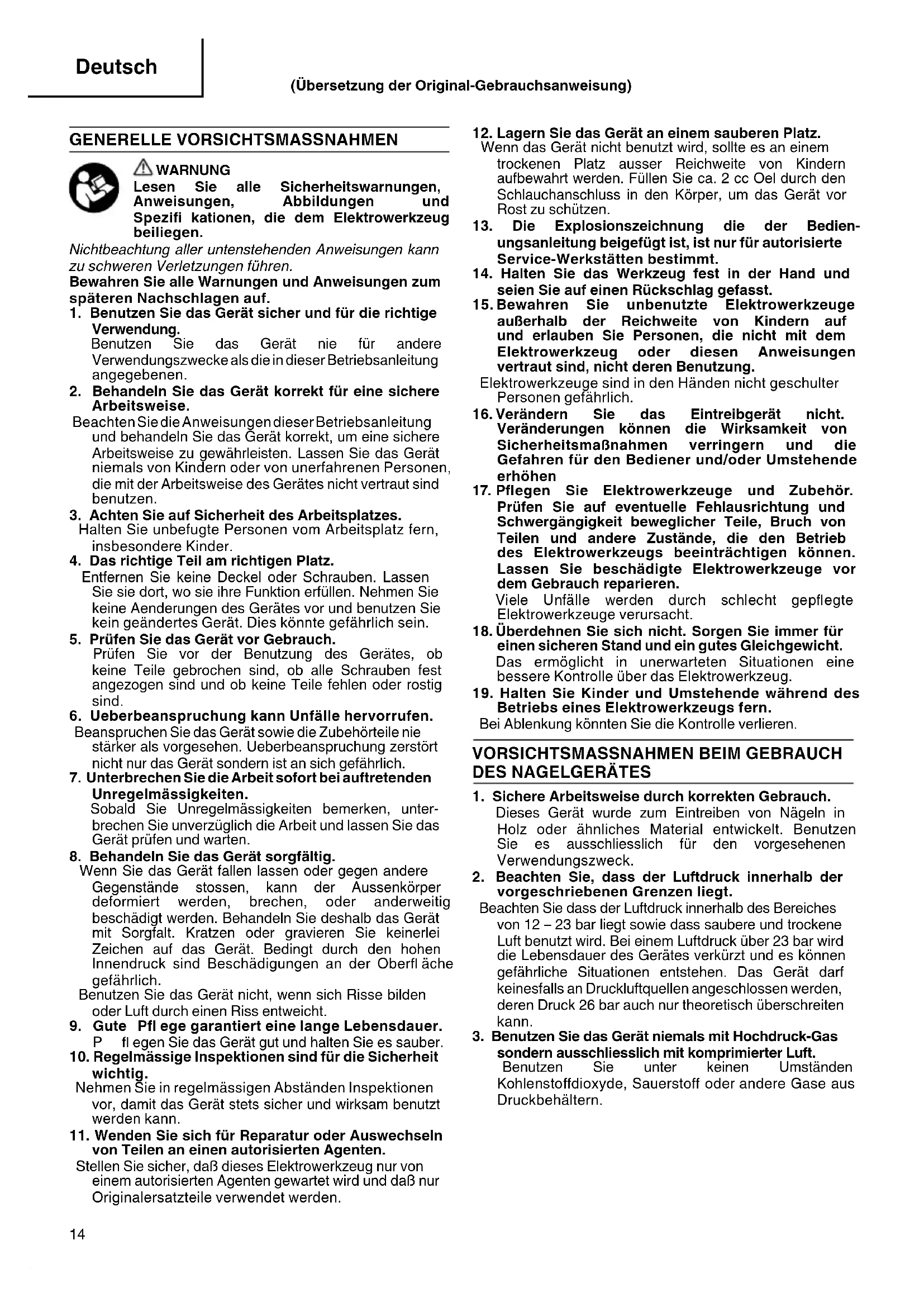 Da während des Nagelns Funken umherfl iegen können ist est gefährlich, das Gerät in der Nähe von Lacken, Farben, Benzin, Verdünnern, Gasolinen, Gas, Klebstoff en oder ähnlichen brennbaren Substanzen zu benutzen, da diese sich entzünden oder explodieren können. Das Gerät darf aus diesem Grunde unter keinen Umständen in der Nähe solcher brennbaren Materialien benutzt werden.