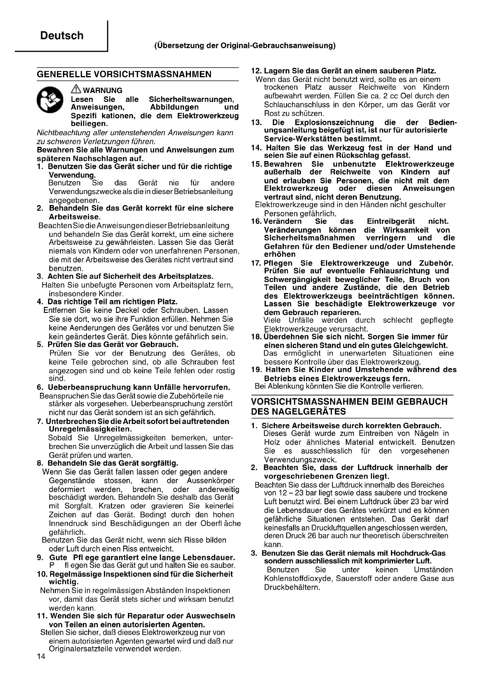 This values is a tool-related characteristic value and does not represent the infl uence to the hand-arm-system when using the tool. An infl uence to the hand-arm-system when using the tool will for example depend on the gripping force, the contact pressure force, the working direction, the adjustment of energy supply, the workpiece, the workpiece support. 0000BookNC50HWE.indb130000BookNC50HWE.indb13 2019/08/0810:52:542019/08/0810:52:5414 Deutsch GENERELLE VORSICHTSMASSNAHMEN WARNUNG Lesen Sie alle Sicherheitswarnungen, Anweisungen, Abbildungen und Spezifi kationen, die dem Elektrowerkzeug beiliegen. Nichtbeachtung aller untenstehenden Anweisungen kann zu schweren Verletzungen führen. Bewahren Sie alle Warnungen und Anweisungen zum späteren Nachschlagen auf.