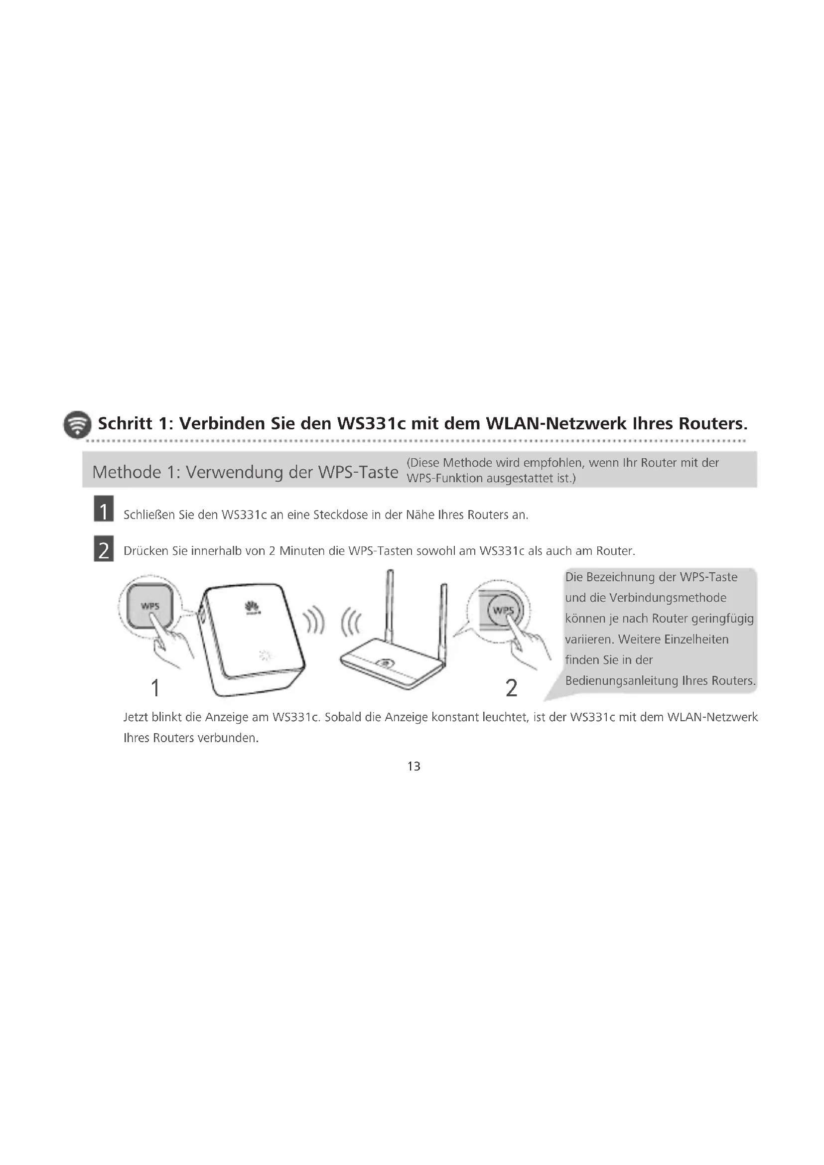 Schließen Sie den WS331c an eine Steckdose in der Nähe Ihres Routers an. Drücken Sie innerhalb von 2 Minuten die WPS-Tasten sowohl am WS331c als auch am Router. Jetzt blinkt die Anzeige am WS331c. Sobald die Anzeige konstant leuchtet, ist der WS331c mit dem WLAN-Netzwerk Ihres Routers verbunden. Die Bezeichnung der WPS-Taste und die Verbindungsmethode können je nach Router geringfügig variieren. Weitere Einzelheiten finden Sie in der Bedienungsanleitung Ihres Routers. Methode 1: Verwendung der WPS-Taste (Diese Methode wird empfohlen, wenn Ihr Router mit der WPS-Funktion ausgestattet ist.)