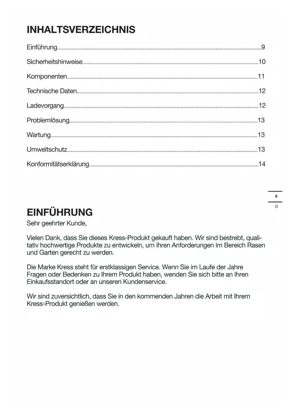 - Konformitätserklärung EINFÜHRUNG Sehr geehrter Kunde, Vielen Dank, dass Sie dieses Kress-Produkt gekauft haben. Wir sind bestrebt, quali- tativ hochwertige Produkte zu entwickeln, um Ihren Anforderungen im Bereich Rasen und Garten gerecht zu werden. Die Marke Kress steht für erstklassigen Service. Wenn Sie im Laufe der Jahre Fragen oder Bedenken zu Ihrem Produkt haben, wenden Sie sich bitte an Ihren Einkaufsstandort oder an unseren Kundenservice. Wir sind zuversichtlich, dass Sie in den kommenden Jahren die Arbeit mit Ihrem Kress-Produkt genießen werden.D p. 14