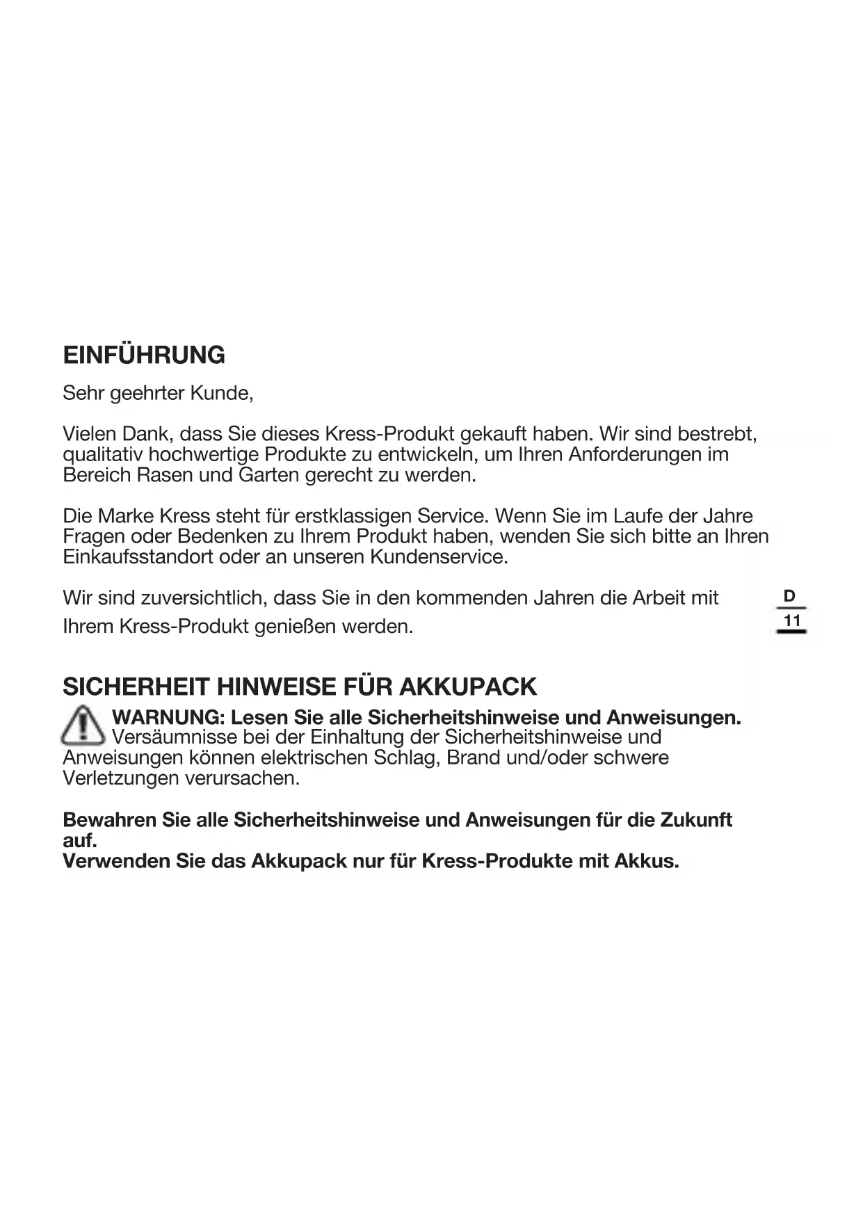WARNUNG: Lesen Sie alle Sicherheitshinweise und Anweisungen. Versäumnisse bei der Einhaltung der Sicherheitshinweise und Anweisungen können elektrischen Schlag, Brand und/oder schwere Verletzungen verursachen. Bewahren Sie alle Sicherheitshinweise und Anweisungen für die Zukunft auf. Verwenden Sie das Akkupack nur für Kress-Produkte mit Akkus.12