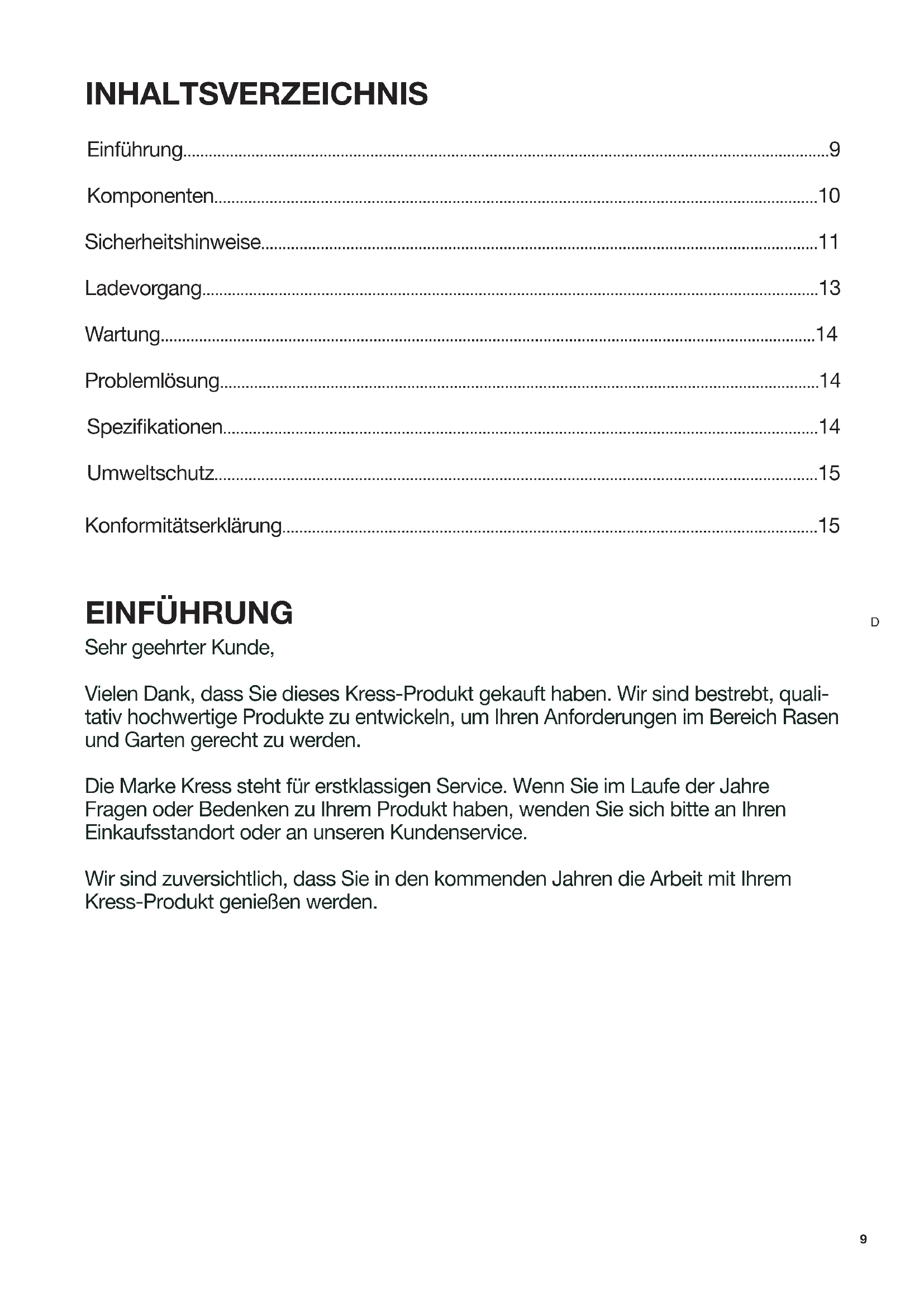 - Konformitätserklärung EINFÜHRUNG Sehr geehrter Kunde, Vielen Dank, dass Sie dieses Kress-Produkt gekauft haben. Wir sind bestrebt, quali- tativ hochwertige Produkte zu entwickeln, um Ihren Anforderungen im Bereich Rasen und Garten gerecht zu werden. Die Marke Kress steht für erstklassigen Service. Wenn Sie im Laufe der Jahre Fragen oder Bedenken zu Ihrem Produkt haben, wenden Sie sich bitte an Ihren Einkaufsstandort oder an unseren Kundenservice. Wir sind zuversichtlich, dass Sie in den kommenden Jahren die Arbeit mit Ihrem Kress-Produkt genießen werden.10 p. 15