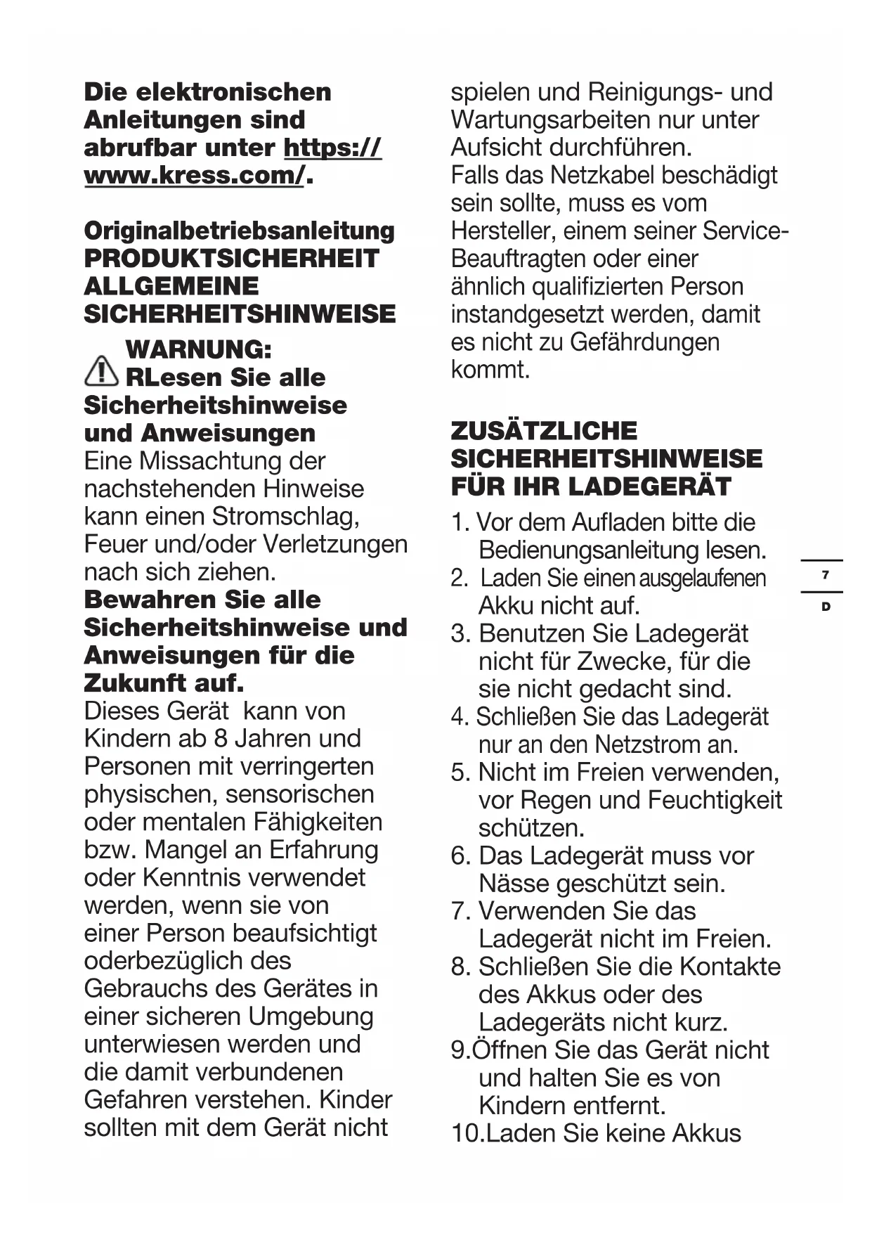 Die elektronischen Anleitungen sind abrufbar unter https:// www.kress.com/. Originalbetriebsanleitung PRODUKTSICHERHEIT ALLGEMEINE SICHERHEITSHINWEISE WARNUNG: RLesen Sie alle Sicherheitshinweise und Anweisungen Eine Missachtung der nachstehenden Hinweise kann einen Stromschlag, Feuer und/oder Verletzungen nach sich ziehen. Bewahren Sie alle Sicherheitshinweise und Anweisungen für die Zukunft auf. Dieses Gerät kann von Kindern ab 8 Jahren und Personen mit verringerten physischen, sensorischen oder mentalen Fähigkeiten bzw. Mangel an Erfahrung oder Kenntnis verwendet werden, wenn sie von einer Person beaufsichtigt oderbezüglich des Gebrauchs des Gerätes in einer sicheren Umgebung unterwiesen werden und die damit verbundenen Gefahren verstehen. Kinder sollten mit dem Gerät nicht spielen und Reinigungs- und Wartungsarbeiten nur unter Aufsicht durchführen. Falls das Netzkabel beschädigt sein sollte, muss es vom Hersteller, einem seiner Service- Beauftragten oder einer ähnlich qualizierten Person instandgesetzt werden, damit es nicht zu Gefährdungen kommt. ZUSÄTZLICHE SICHERHEITSHINWEISE